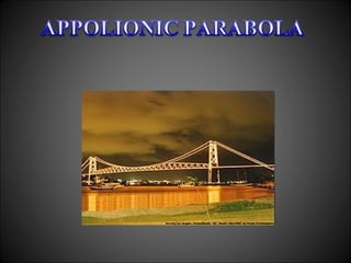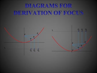 The document discusses parabolas, including their key properties and equations. It defines a parabola as the set of points equidistant from a fixed point (the focus) and a fixed line (the directrix). The document derives the standard equation of a parabola from this definition and discusses how to graph parabolas based on their equations. It also covers transformations, latus rectum, and other geometric properties of parabolas.