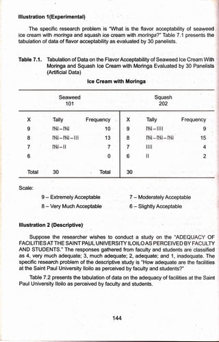 1) The document discusses data processing, statistical treatment, analysis, and interpretation of results gathered in research. It describes the basic steps of data processing as categorization, coding, and tabulation of data.