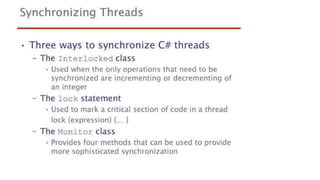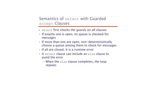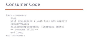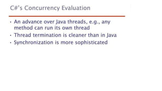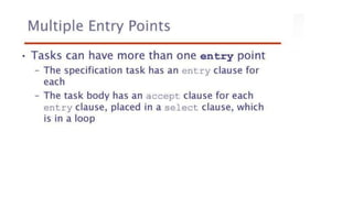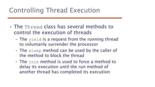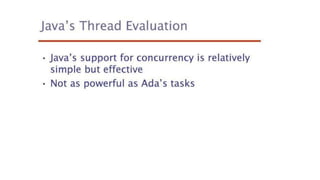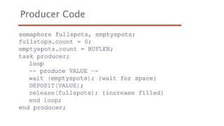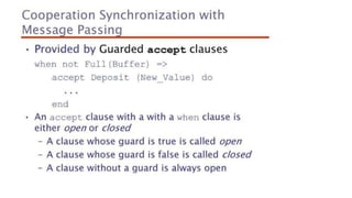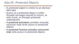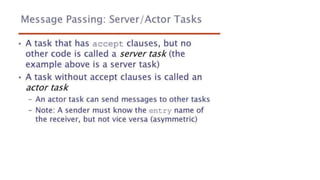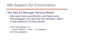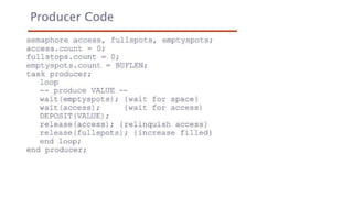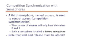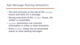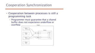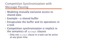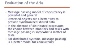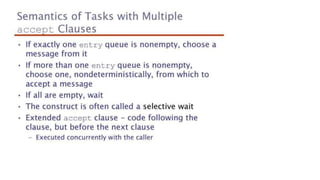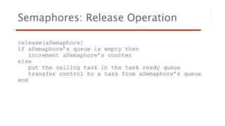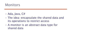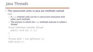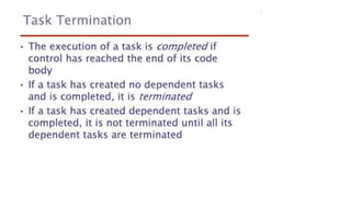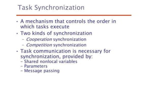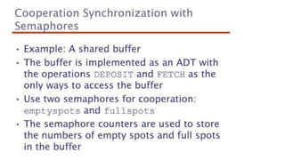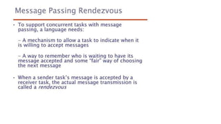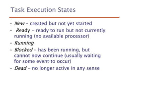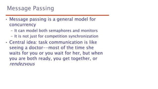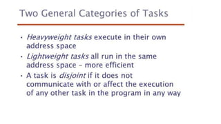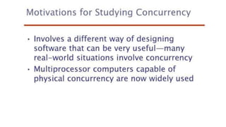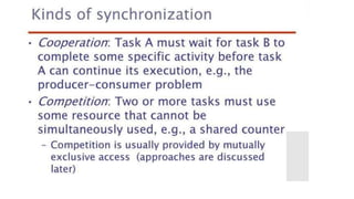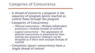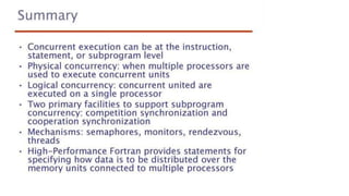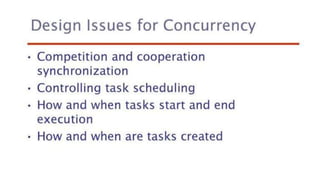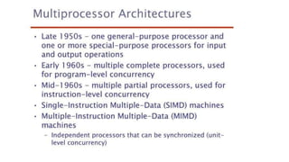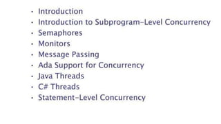 This document lists 24 questions about concurrency and parallel programming. It covers topics such as different levels of concurrency, SIMD and MIMD models, task types, synchronization techniques like semaphores and monitors, schedulers, task lifecycles, liveness and deadlock, synchronization implementations in Java, message passing, task termination, thread priorities, and statement level concurrency.