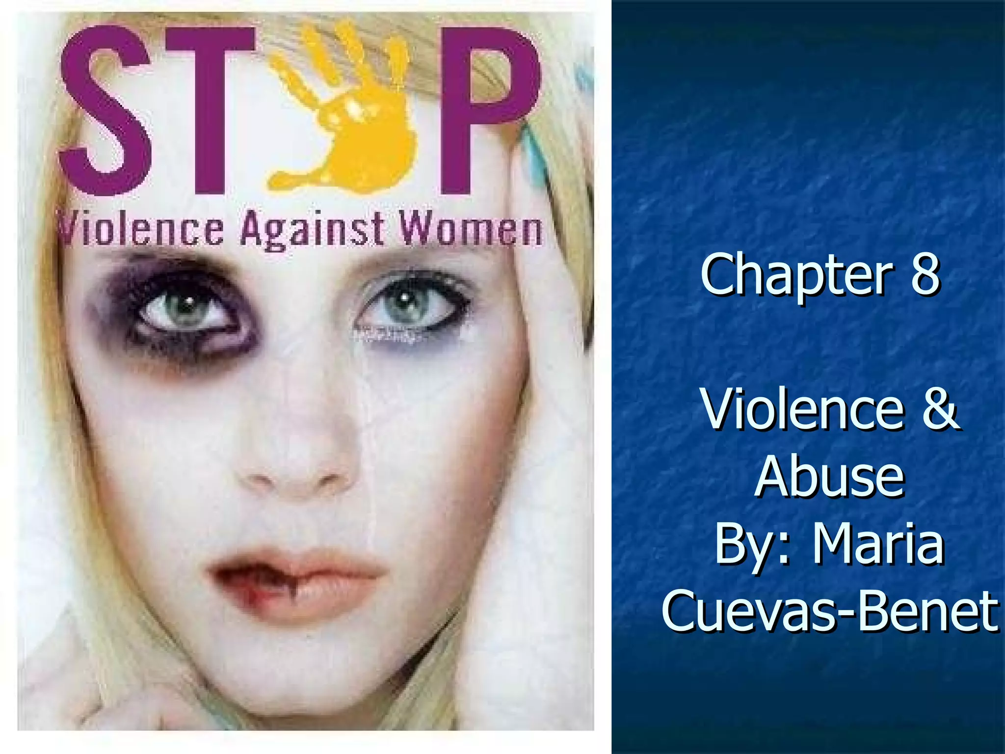 The document discusses violence and abuse against women. It defines domestic violence, dating violence, and other types of violence women face. It provides statistics on domestic violence in the US, such as 1 in 4 women experiencing intimate partner violence. It also lists signs of abusive and unhealthy relationships, and signs of healthy relationships. It includes quotes about violence against women from public figures.