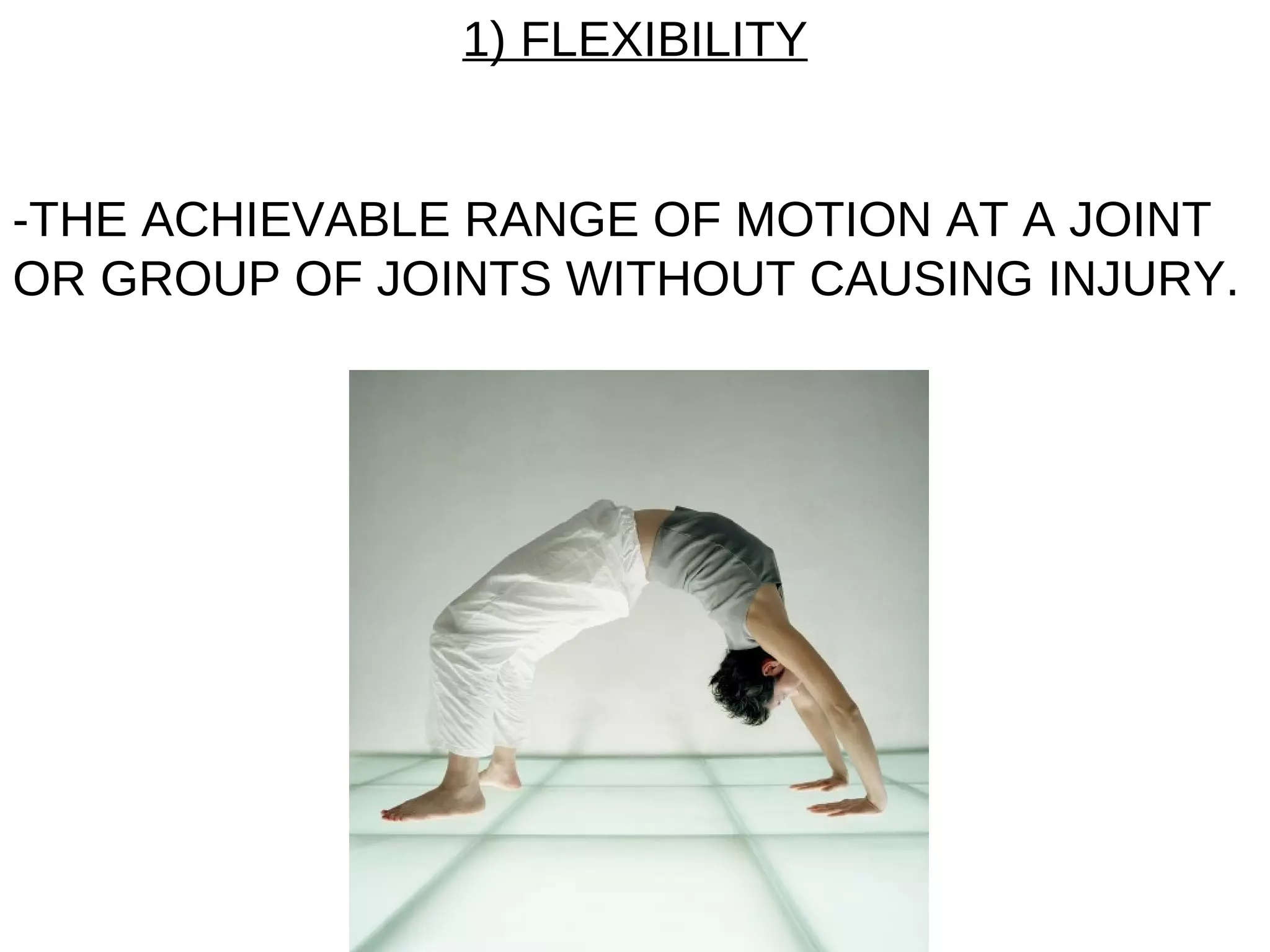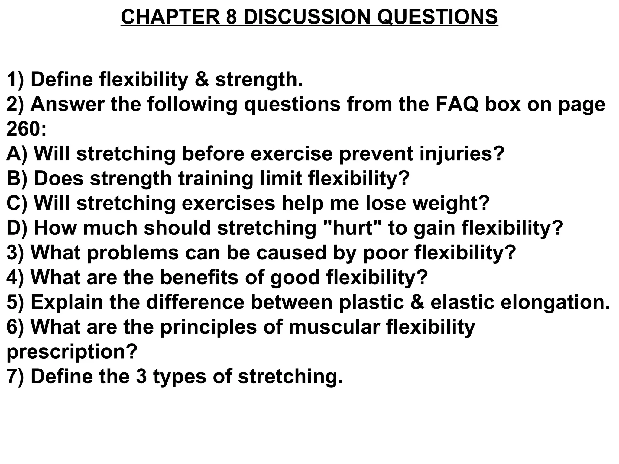 This document discusses flexibility, stretching, and related topics. It begins by defining flexibility and stretching. It then answers common questions about stretching, such as whether it prevents injuries or helps with weight loss. The document discusses the benefits of flexibility and problems caused by poor flexibility. It explains the differences between plastic and elastic elongation. Finally, it covers principles of flexibility prescription, including different stretching modes, intensity, repetitions, and frequency.