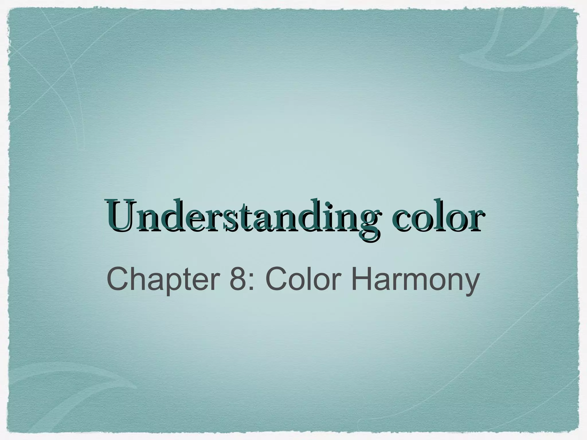 1. Color harmony occurs when colors are sensed together as a pleasing collective impression. It requires balance and relationships between elements.