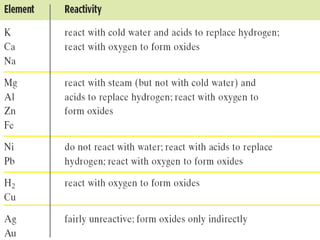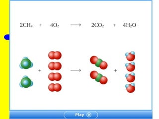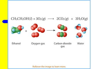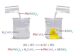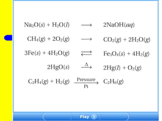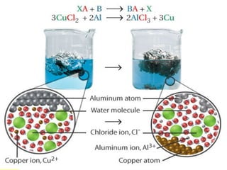 The document provides information about chemical reactions, including defining reactants and products, describing types of chemical reactions like synthesis, decomposition, double displacement, displacement and combustion reactions. It also discusses how to write and balance chemical equations.