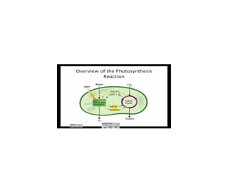This document summarizes photosynthesis. It discusses the history of discoveries about photosynthesis and defines key terms like autotrophs and heterotrophs. It then explains that photosynthesis uses light energy to convert carbon dioxide and water into glucose and oxygen. This occurs in two stages within the chloroplast - the light-dependent reaction uses light to produce ATP and NADPH, while the light-independent Calvin cycle uses those products to produce glucose from carbon dioxide. Factors like temperature, light intensity, and water affect the process.