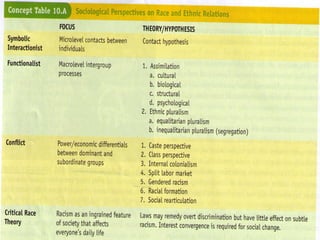 The document explores the concepts of race and ethnicity, defining race as a socially constructed category based on perceived biological differences, and ethnicity as based on cultural traits such as language and nationality. It discusses the historical context of racial classifications, the nature of minority groups, and the manifestations of racism, prejudice, and discrimination. Additionally, it highlights the impact of race and ethnicity on life chances in areas like healthcare, education, and income, and outlines various theories and models of race relations.