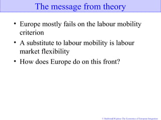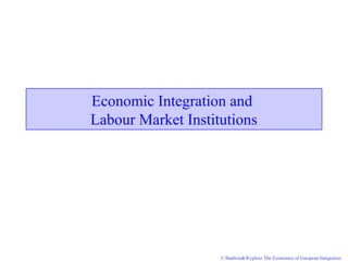 The document discusses how economic integration challenges existing labor market institutions in Europe. It finds that European labor markets are generally rigid, with high unemployment, low participation rates, and long spells of unemployment. This is due to features like real wage rigidity, restrictions on hiring/firing, minimum wages, and generous unemployment benefits. Deeper economic integration exacerbates competition and reduces firms' flexibility to respond to shocks under these rigid systems. The document outlines three possible evolutions in response: two-speed Europe with flexible and inflexible systems, reforms to make labor markets more flexible, or social harmonization across Europe.