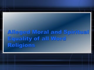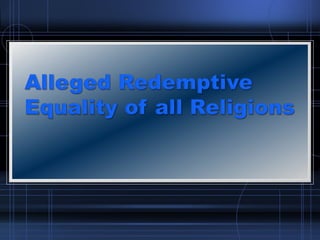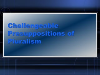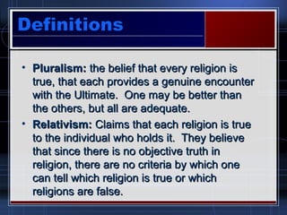This document discusses and critiques pluralism and exclusivism in religion. It defines pluralism as the belief that all religions are true, while exclusivism is the belief that only one religion is true. The document analyzes John Hick's argument that religions should be viewed equally based on their moral teachings. However, several responses note that moral behavior does not prove religious truth claims. The document concludes that pluralism's view of truth is self-defeating, as it denies any single religion could be exclusively true while claiming its own view is correct.