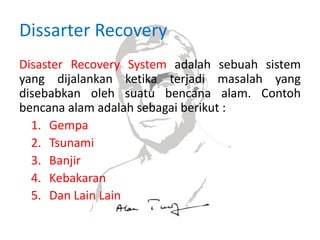 Dokumen tersebut membahas tentang sistem keamanan komputer khususnya terkait disaster recovery dan business continuity plan. Disaster recovery system digunakan untuk memulihkan sistem ketika terjadi bencana alam seperti gempa, banjir, kebakaran. Sedangkan business continuity plan merupakan rencana untuk melanjutkan bisnis perusahaan di saat terjadi gangguan dan mencakup aktivitas mengurangi, merespon, memulihkan, dan mengembalikan kondisi semula. Proses business