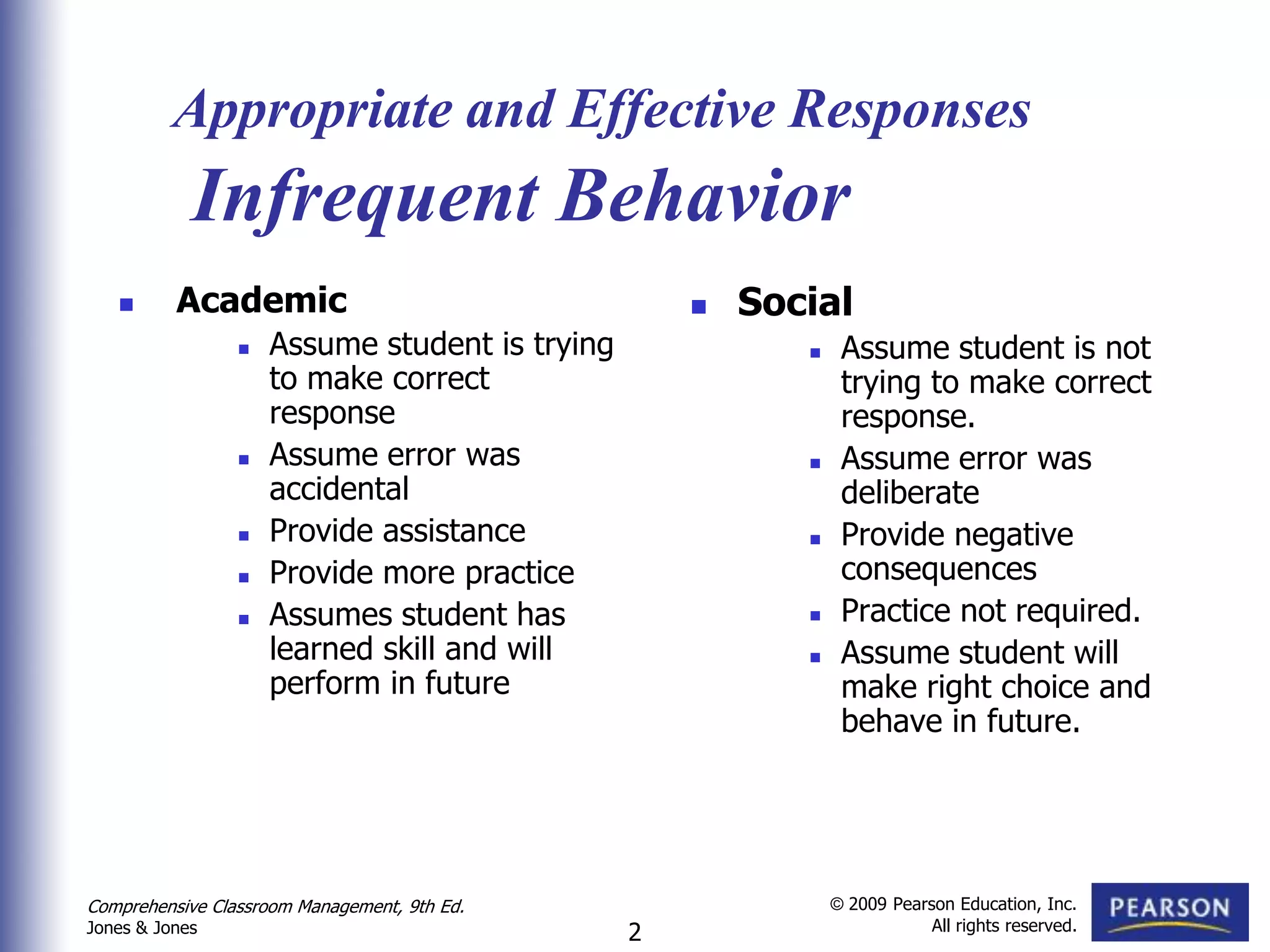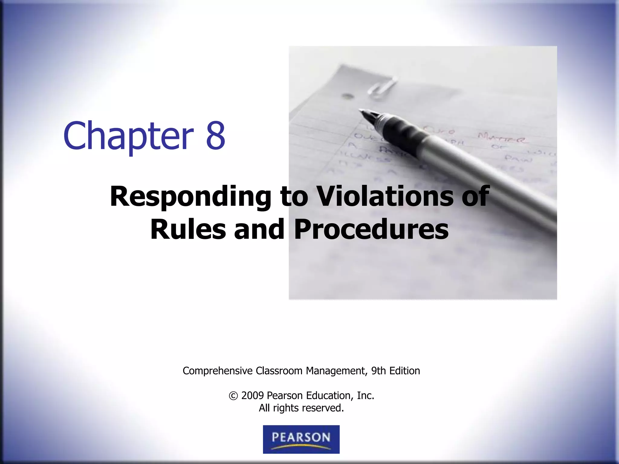 Chapter 8 discusses effective strategies for responding to both minor and major disruptive behaviors in the classroom, emphasizing the importance of assumptions about student intentions and the use of appropriate consequences. It outlines general methods for managing behavior, including clear expectations, calm communication, and the role of positive relationships in reducing conflicts. Additionally, it highlights the benefits of problem-solving approaches over punitive measures to foster a supportive learning environment.