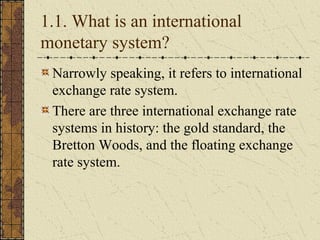 (1) The document discusses different international monetary systems including the gold standard, Bretton Woods system, and floating exchange rate system.