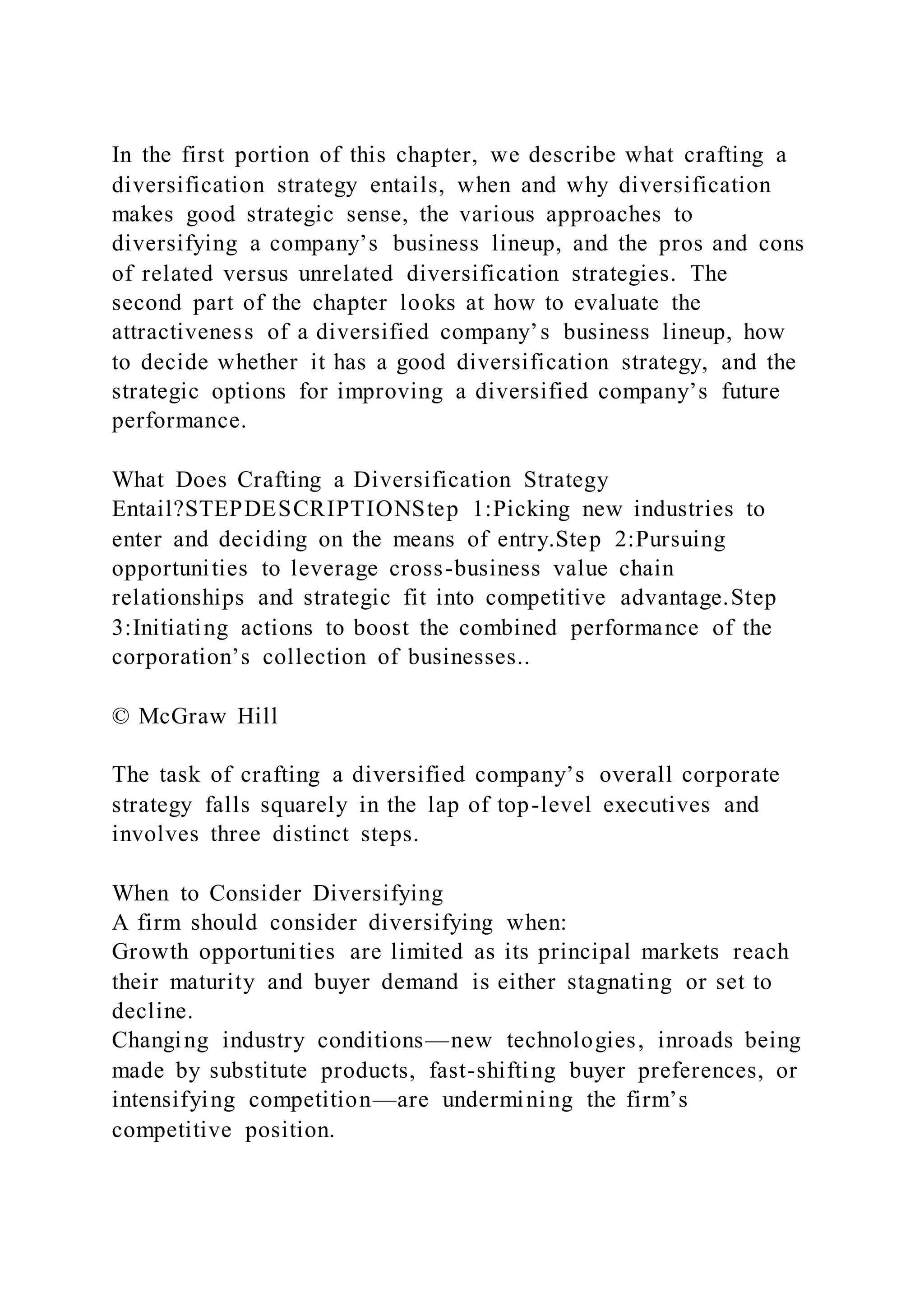 This chapter discusses corporate strategy for diversified multibusiness companies. It covers evaluating a company's diversification strategy, including pursuing related diversification through strategic fits across value chains. Related diversification can enhance shareholder value by leveraging specialized resources and capabilities between businesses. However, diversification only makes strategic sense if it passes tests showing the new industry is attractive, costs of entry can be overcome, and synergies will improve overall performance.