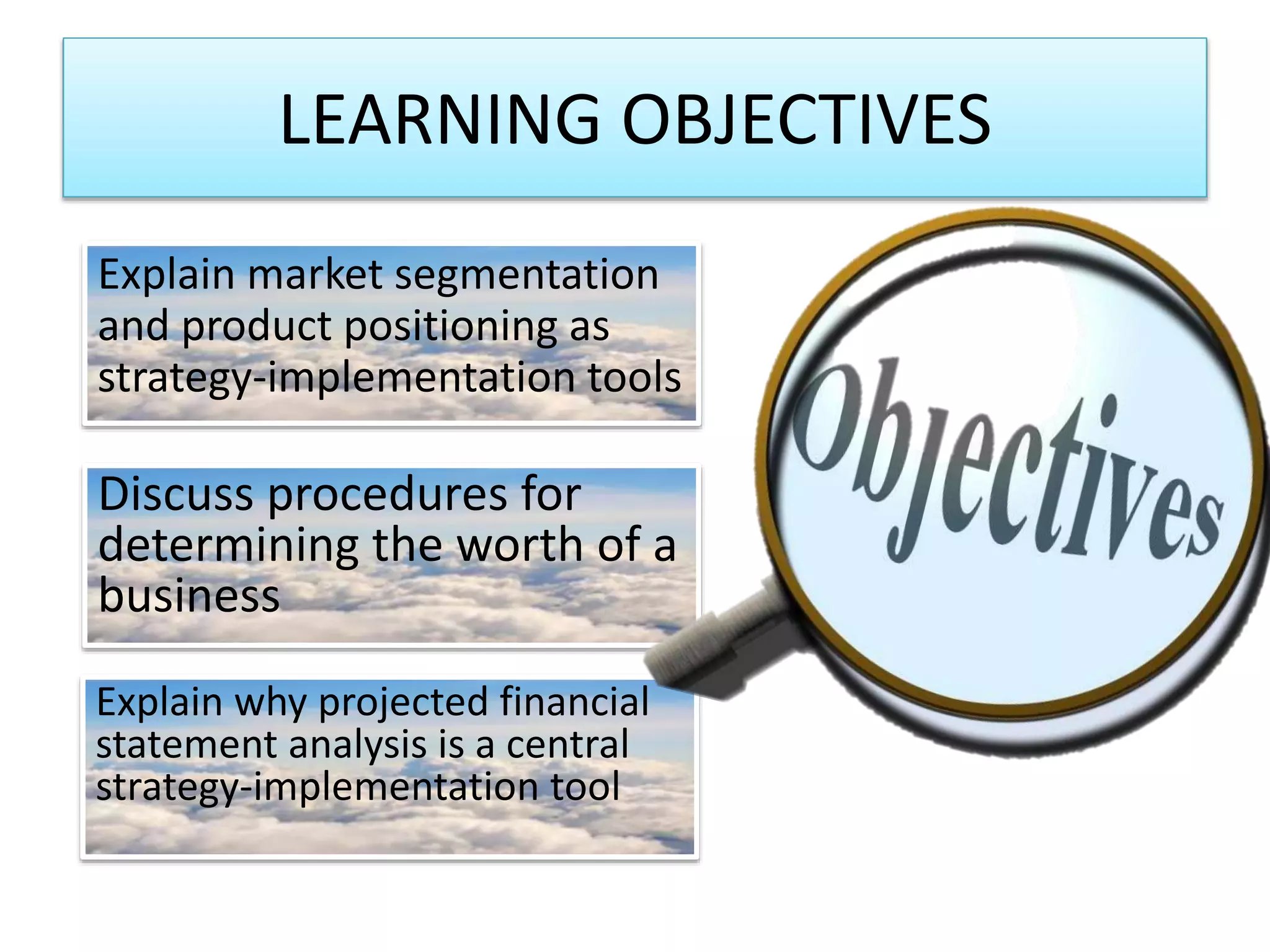 This document discusses key issues in implementing strategies related to marketing, finance/accounting, research and development (R&D), and management information systems (MIS). It explains that market segmentation and product positioning are important tools for implementing strategies. It also discusses determining a business's worth, developing projected financial statements, acquiring needed capital through equity or debt, and using budgets. The document notes that R&D approaches can allow firms to be first-to-market or low-cost producers. Finally, it states that an effective MIS system can help differentiate successful firms by collecting, storing, and sharing important information.