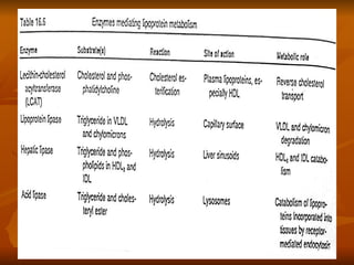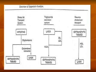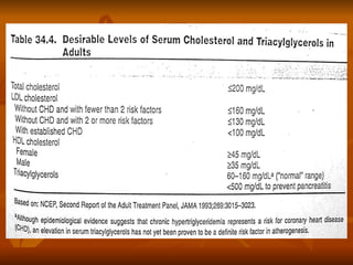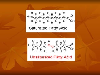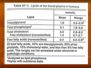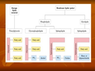 This document discusses lipids and their classification and functions. It describes the main categories of lipids including fatty acids, glycerolipids, glycerophospholipids, sphingolipids, sterol lipids, prenol lipids, and saccharolipids. Key points include that fatty acids are the basic building blocks of lipids and can be saturated or unsaturated. Glycerolipids like triglycerides function in energy storage. Glycerophospholipids make up the lipid bilayer of cells. Sphingolipids contain sphingoid bases and include cerebrosides and gangliosides. Cholesterol is an important sterol lipid that structures membranes. Imbalances in lipid metabolism can lead to