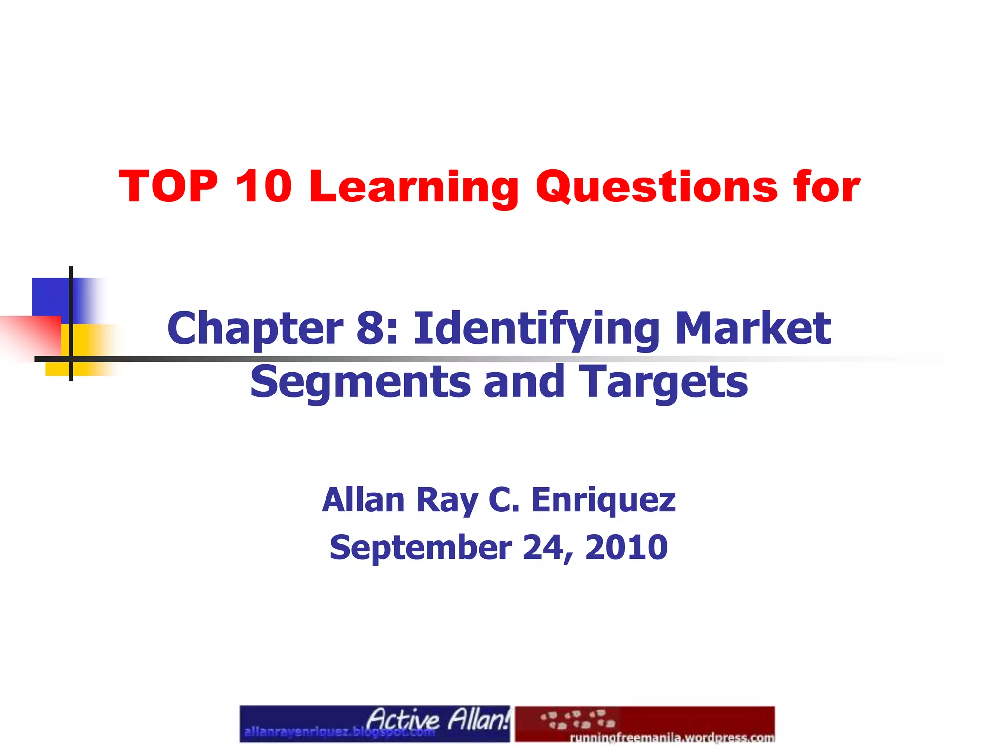 This document contains 10 learning questions about market segmentation from Chapter 8. It discusses the four levels of micromarketing - segments, niches, local areas, and individuals. Question 1 asks about niches, which are more narrowly defined customer groups. Question 2 asks about life stage defining a person's major concern in demographic segmentation. Question 3 asks about the exception to target markets. Question 4 asks about the criteria market segments must be, with the exception being flexible. Question 5 asks about a false statement in demographic segmentation. Question 6 asks about the exception in criteria for useful market segments. Question 7 asks about Manila Beer's local area marketing strategy. Question 8 asks about life stage segmentation in RunRio's marketing. Question 9 asks