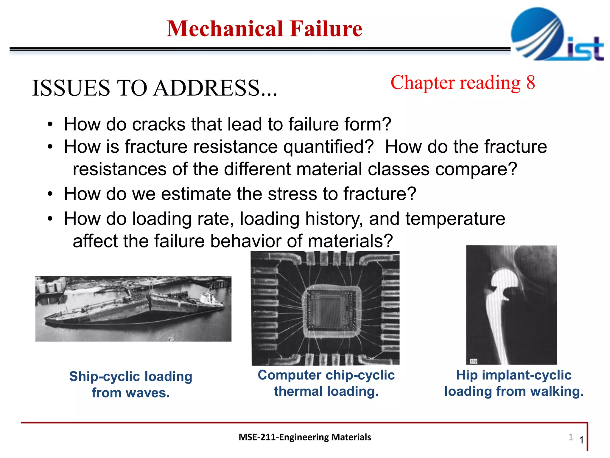 The document discusses mechanical failure and fracture in materials. It addresses how cracks form and propagate, leading to brittle or ductile fracture depending on the material. Stress concentration at crack tips is a key factor. Fracture toughness and impact testing methods are introduced to characterize a material's resistance to fracture. Fatigue failure from cyclic stresses often initiates at flaws and can occur at stresses below typical strength values. S-N curves relate the cyclic stress amplitude to the lifetime of a material. Temperature and loading conditions also influence failure behavior.