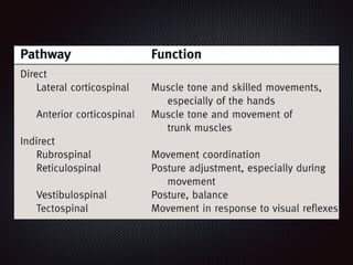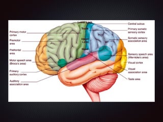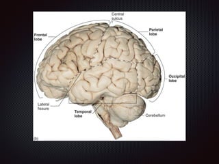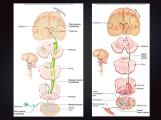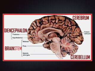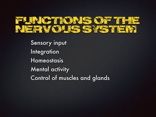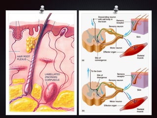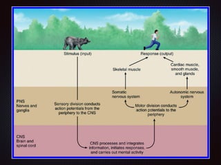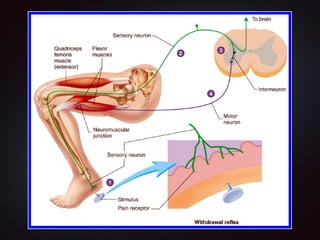 The document discusses the structure and function of the nervous system. It describes how the nervous system is divided into the central nervous system (CNS), which includes the brain and spinal cord, and the peripheral nervous system (PNS). The CNS is further divided into grey matter and white matter. The PNS includes sensory and motor divisions. Key cell types that make up nervous tissue are described such as neurons, glial cells, and myelin sheaths. Reflex arcs and examples of reflexes like the patellar reflex are explained. An overview of the spinal cord, spinal nerves, and plexuses is provided. The major regions of the brainstem and diencephalon are outlined along with some of their functions in regulating