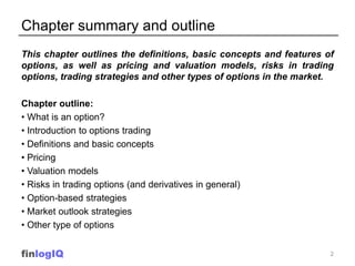 This document provides an overview of options, including definitions, concepts, pricing models, risks, and strategies. It defines options, outlines key terms like premium, strike price, and expiration. It explains pricing models including intrinsic value and factors that affect option prices like underlying price, volatility, and time to expiration. Put-call parity and how options can be used to synthesize other positions are also summarized.