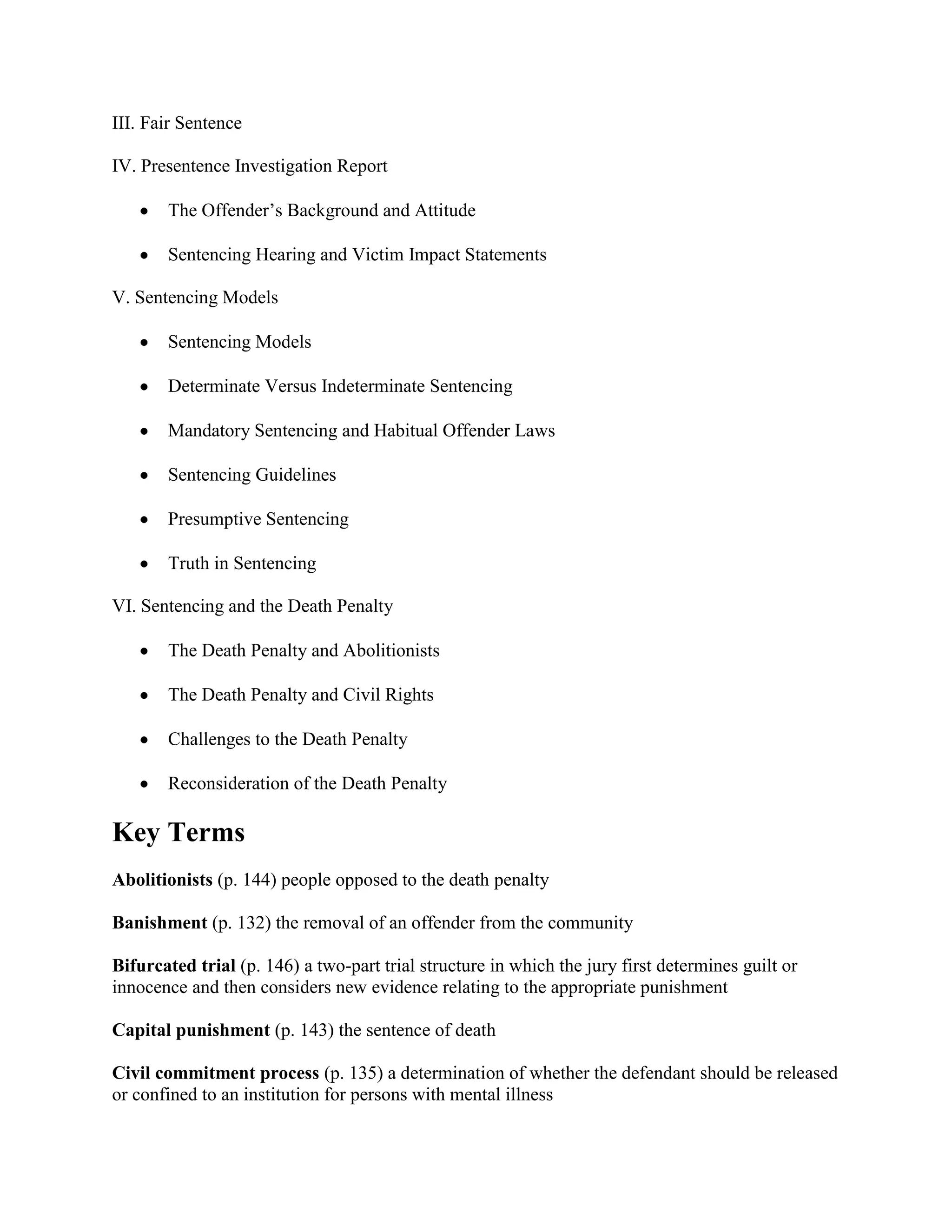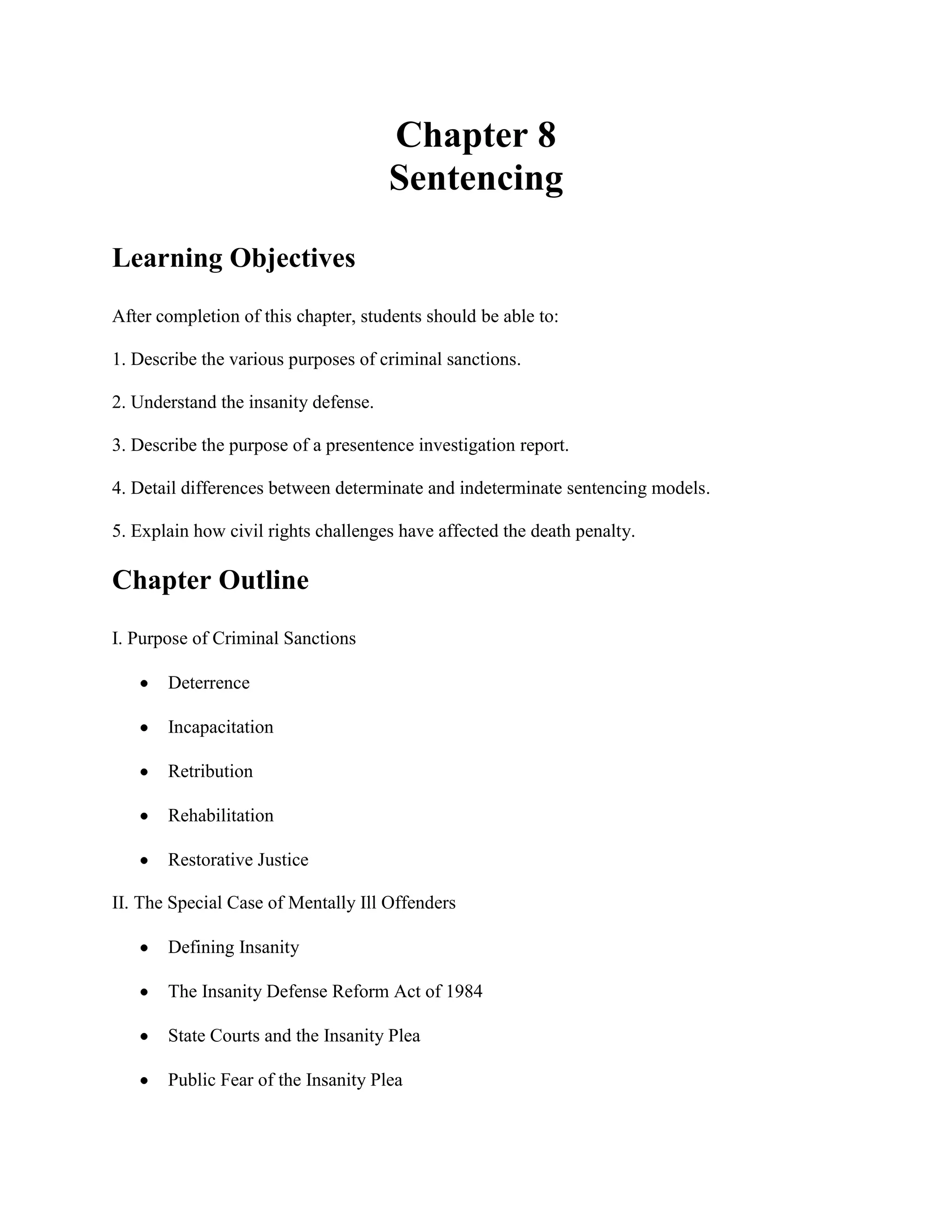 This chapter discusses criminal sentencing, including the philosophies that justify sanctions like deterrence, incapacitation, retribution, rehabilitation, and restorative justice. It also addresses mentally ill offenders and the insanity defense. There are two major sentencing models: indeterminate sentencing based on parole and structured sentencing using guidelines, determinate sentences, and presumptive sentencing. Mandatory sentencing and three-strikes laws are examples of structured sentencing. While the death penalty remains controversial, many states are reexamining it due to documented wrongful convictions.