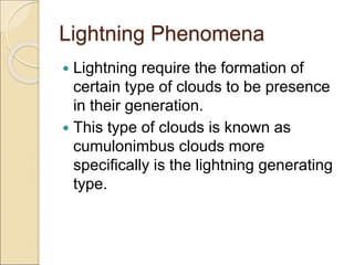 The document discusses lightning phenomena, stroke formation, lightning parameters, empirical design methods, the electrogeometric model (EGM), and insulation coordination. Some key points: