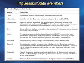 The document discusses various techniques for maintaining state in ASP.NET applications including view state, cookies, query strings, session state, and cross-page posting. View state stores information on the client in a hidden form field, while cookies, query strings, and session state store data on the server. Cookies and session state allow retaining data across requests, while view state and query strings only persist during a single request. Session state is more secure and can store complex objects, while other techniques have limitations like size or visibility of data.