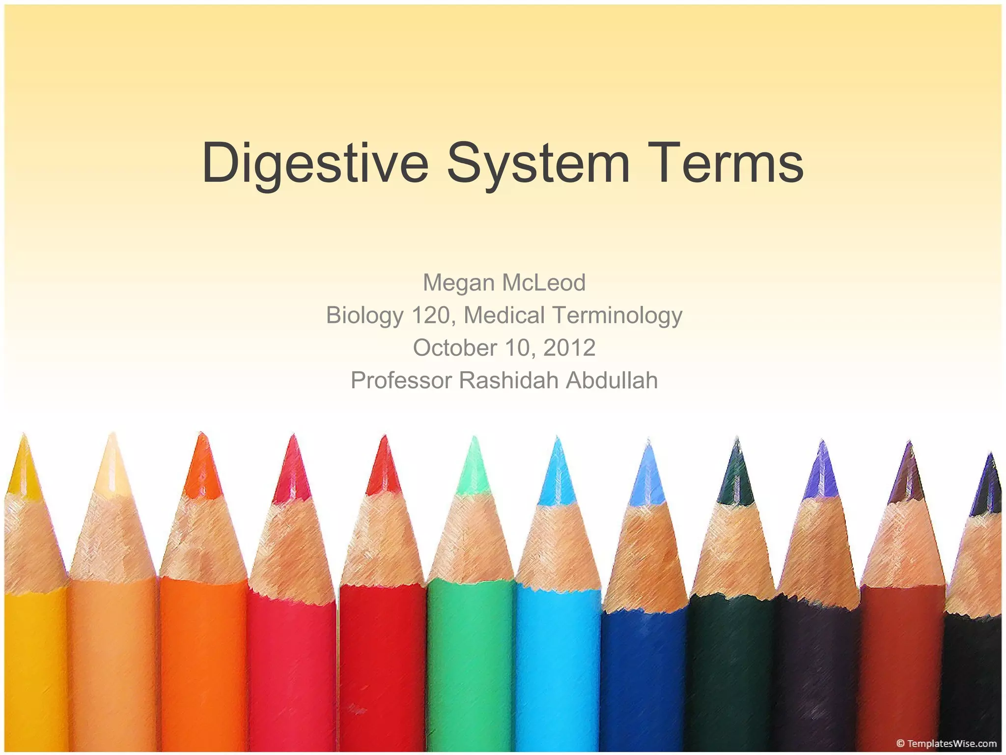 The document defines key terms related to the digestive system, including the location and main organs. It then provides more detailed descriptions of three therapeutic procedures - hernioplasty (hernia repair), extraction (tooth removal), and choledocholithotripsy (gallstone crushing). Each procedure description includes what it is, how it is performed, and common reasons for the procedure. The document concludes by recapping the terms that were defined.