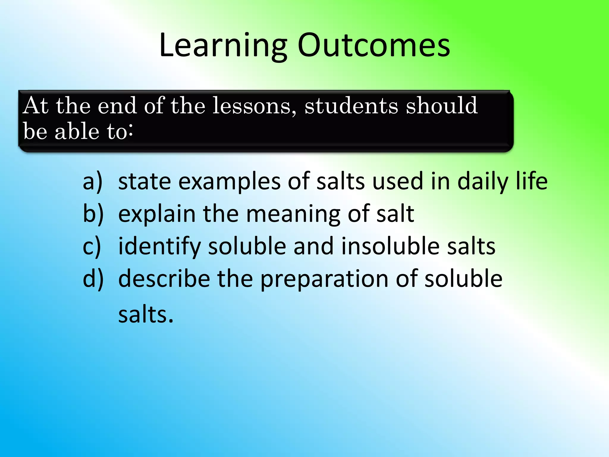 The document discusses learning outcomes about salts. It defines a salt as a compound formed when a hydrogen ion from an acid is replaced by a metal ion or ammonium ion. Examples of commonly used salts include NaCl, MSG, and CaCO3. Salts can be soluble or insoluble depending on their cation and anion. The document also describes different methods for preparing soluble and insoluble salts, such as titration, evaporation/heating, cooling/crystallization, filtration, and drying.