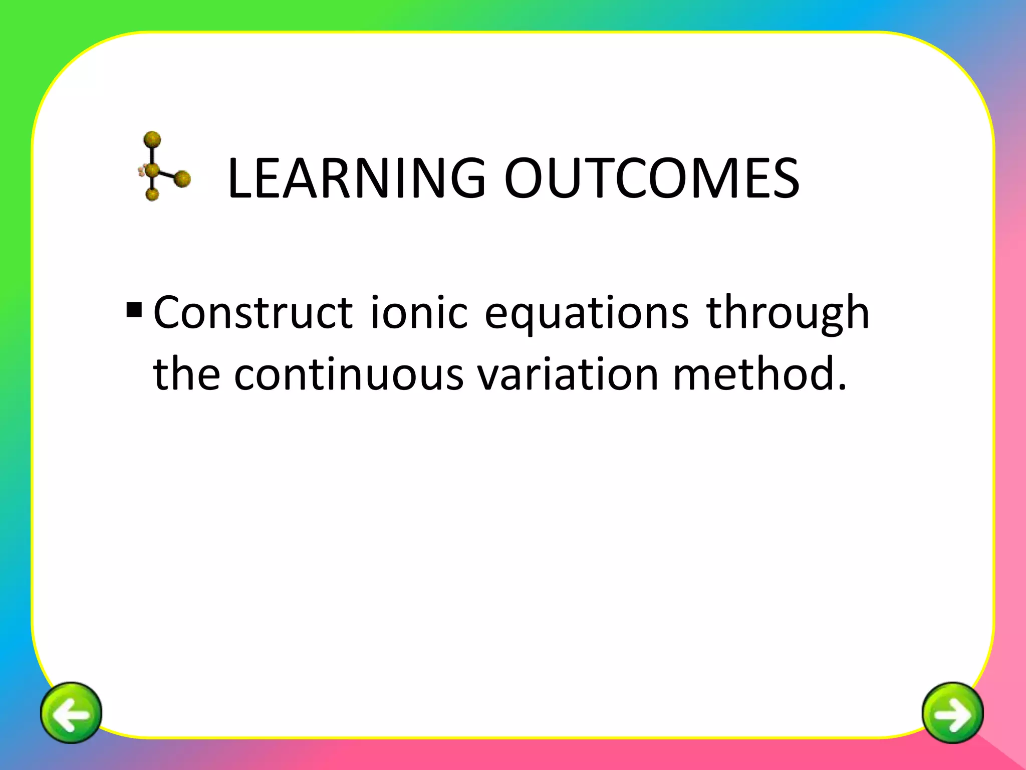 The document describes the continuous variation method used to construct ionic equations for insoluble salts. It involves carrying out experiments where the volume of one reactant is kept fixed while the volume of the other reactant is varied. The mole ratio of the reactants that results in all of the first reactant reacting indicates the ratio in the ionic equation. An example using lead (II) chromate (PbCrO4) precipitation is provided to illustrate the method.