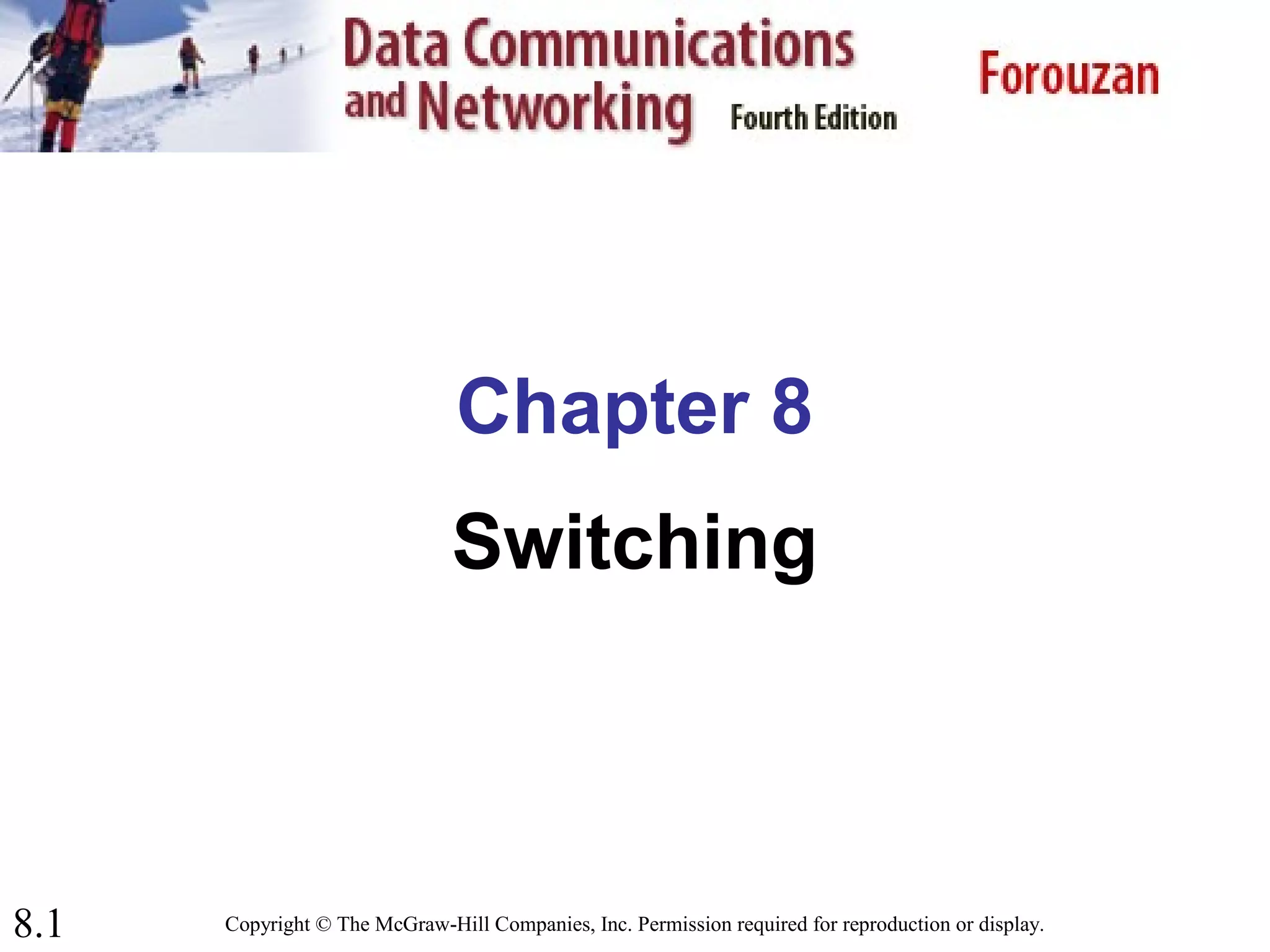 A circuit-switched network consists of switches connected by physical links, where each link is divided into channels. A connection uses a dedicated path and channel. In circuit switching, resources are reserved during setup and remain dedicated until teardown. In a packet-switched network, packets are sent without resource reservation and resources are allocated on demand. A virtual-circuit network has characteristics of both, where packets traveling between the same source and destination follow the same dedicated path but resources are allocated on demand.