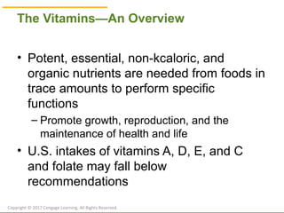This document provides an overview of vitamins. It discusses that vitamins are essential nutrients needed in small amounts that promote growth, reproduction and health. U.S. intake of some vitamins may fall below recommendations. Vitamins differ from other nutrients in their structure, function and dietary intake amounts. Factors like digestion, previous intake and food preparation can impact a vitamin's bioavailability. The document also separates vitamins into fat-soluble and water-soluble categories and discusses the roles and dietary sources of specific vitamins like A, D, E, K, thiamine, riboflavin and folate.
