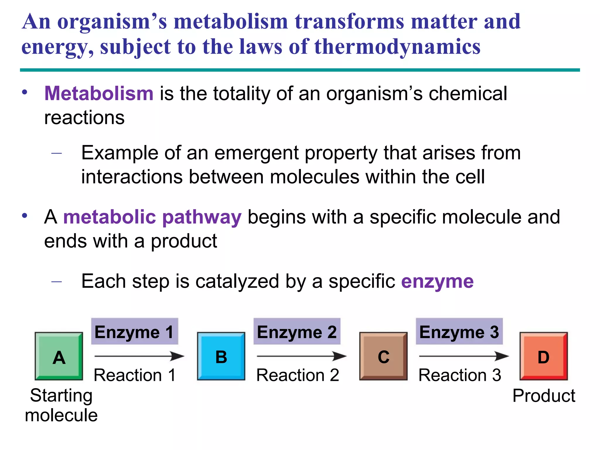 1) Metabolism transforms matter and energy through chemical reactions in organisms, subject to the laws of thermodynamics. Metabolic pathways involve sequences of enzyme-catalyzed reactions that transform starting molecules into products.