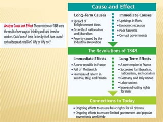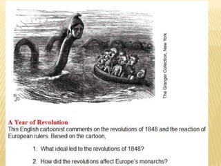 The document discusses the revolutions that occurred across Europe in 1830 and 1848. In 1830, a revolution in Paris inspired uprisings elsewhere that mostly failed except in Belgium, which gained independence. The 1848 revolutions saw further unrest as liberals and nationalists challenged the conservative order, with revolts in places like France, Germany, Austria and Italy, though most were ultimately suppressed by military force.