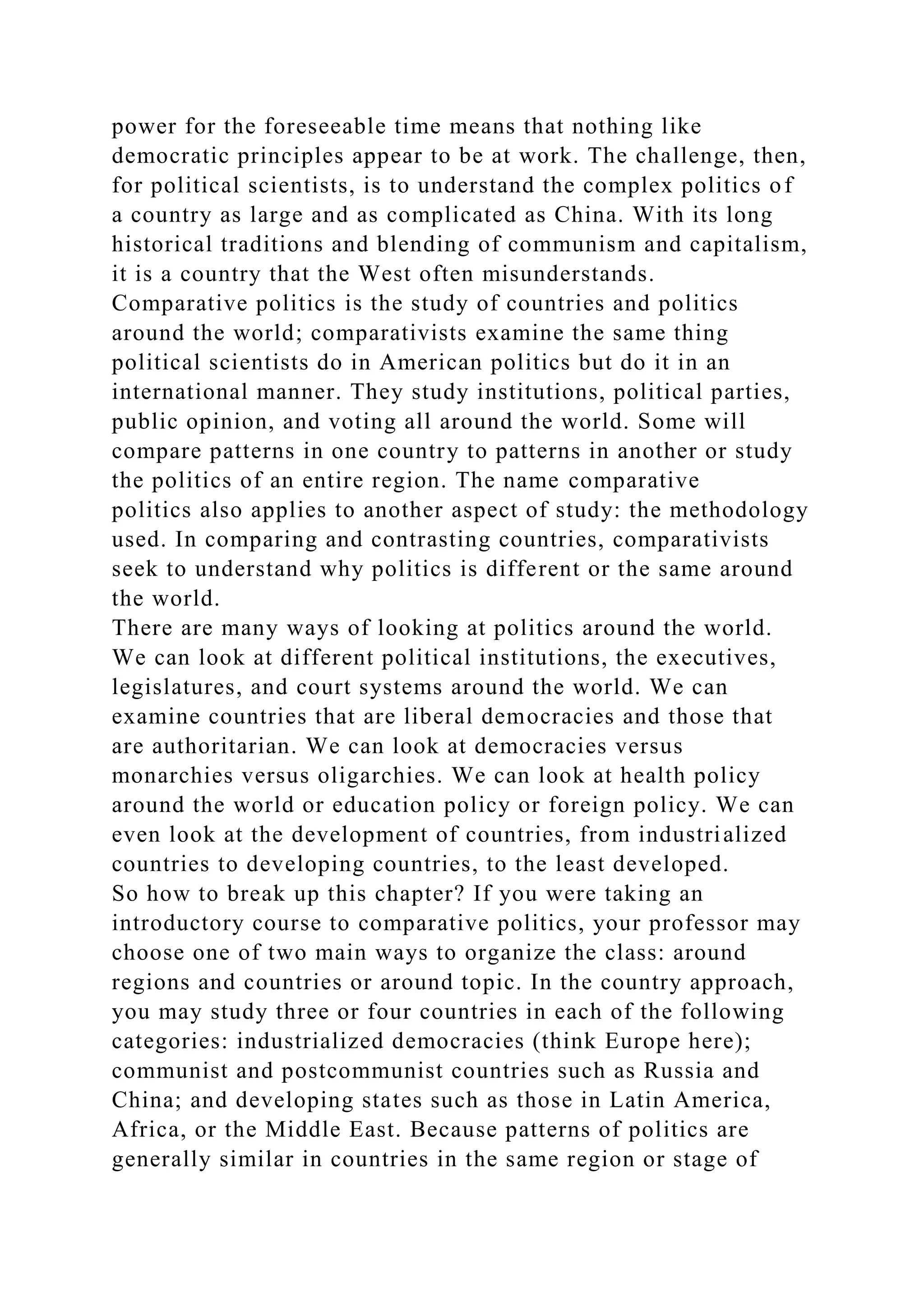 This document discusses comparative politics and the complexities of state formation and governance, emphasizing key concepts such as democracy, nationalism, and the comparative method utilized by political scientists. It highlights the unique political landscape of China under Mao Zedong and Xi Jinping, particularly regarding the blending of communist ideology with capitalist practices and the implications for democracy. The text also reviews theoretical perspectives on the state, its definitions, and the factors influencing state strength and development across different countries.