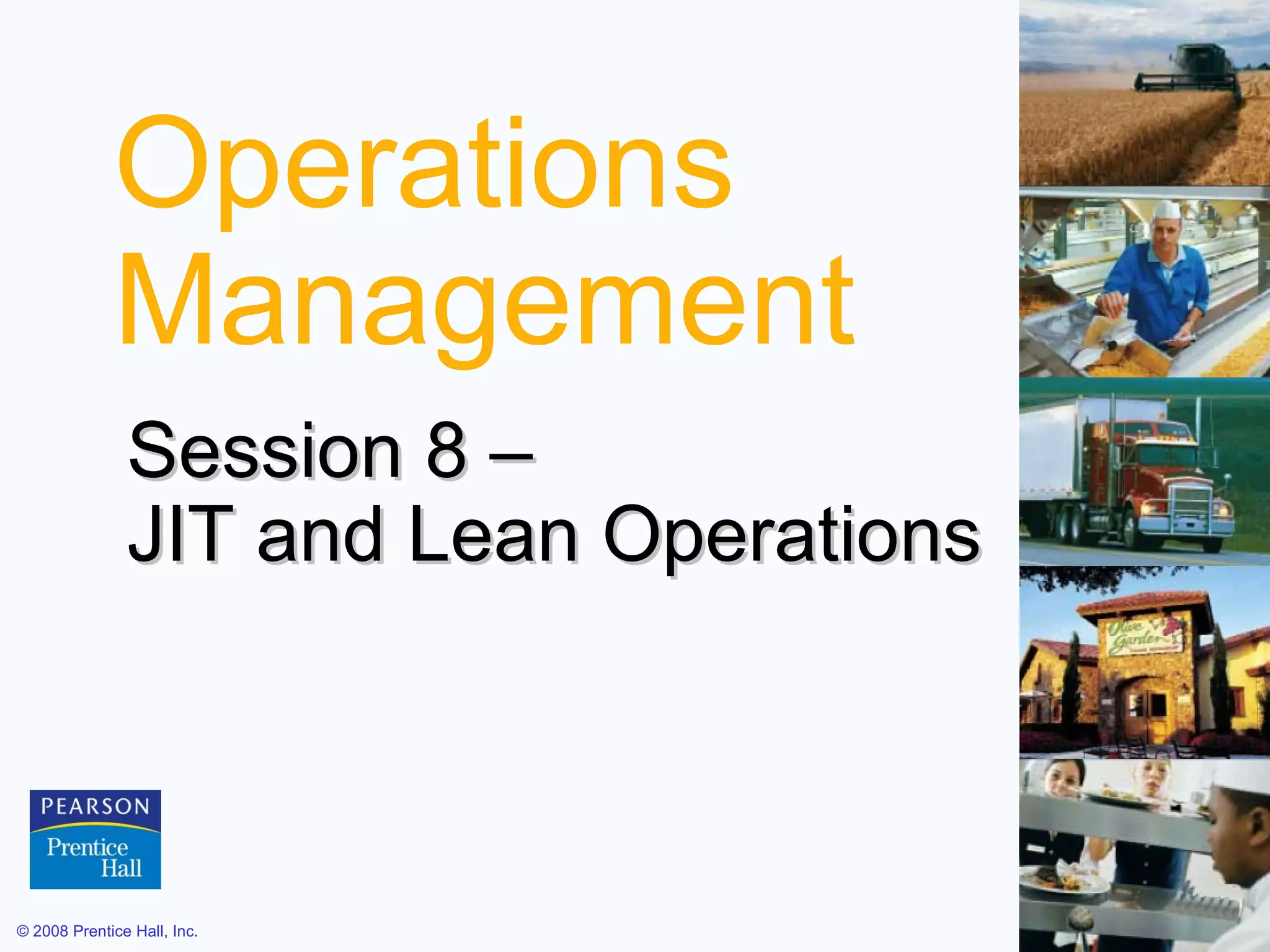 The document discusses just-in-time (JIT) and lean operations. It defines key concepts like JIT, the Toyota Production System (TPS), and lean operations. It explains that JIT emphasizes continuous problem solving and reducing waste and inventory to improve throughput. TPS focuses on continuous improvement, respect for people, and standard work practices. Lean operations aim to supply customers with what they want, when they want it, without waste.