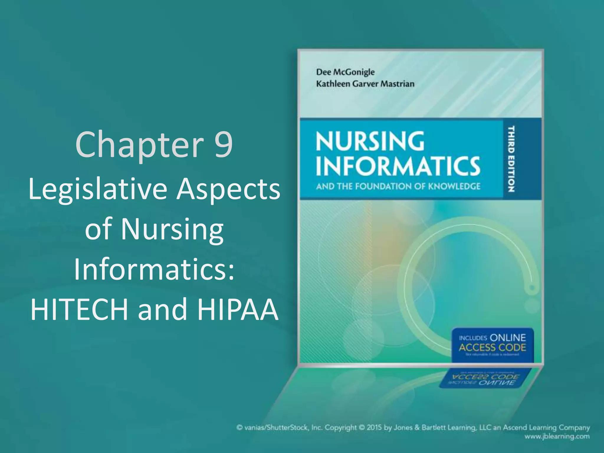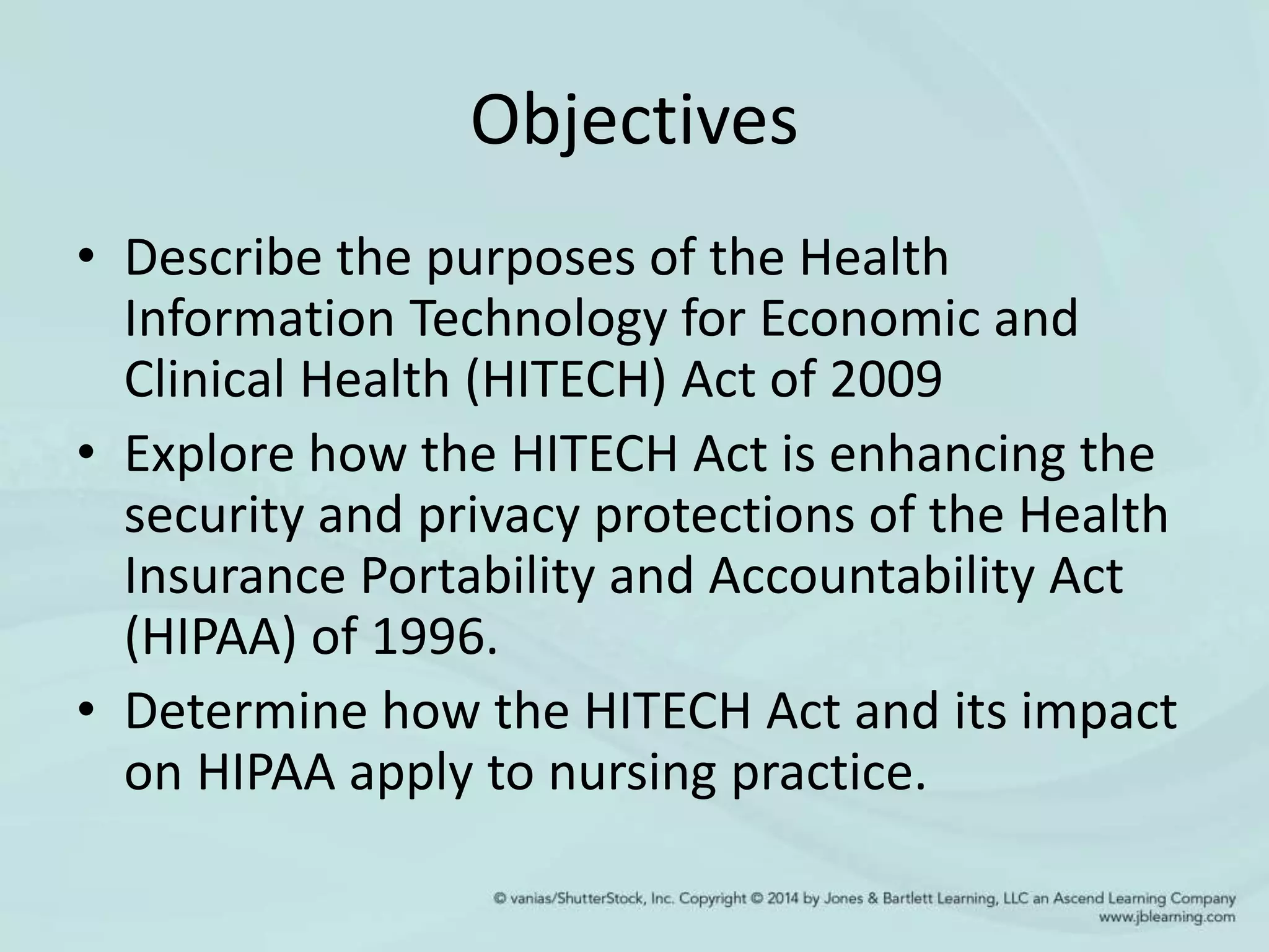 The document discusses the Health Information Technology for Economic and Clinical Health (HITECH) Act of 2009 and how it enhances security and privacy protections under the Health Insurance Portability and Accountability Act (HIPAA) of 1996. The HITECH Act established the Office of the National Coordinator for Health Information Technology to develop a nationwide health information technology infrastructure. It provides monetary incentives for implementing electronic health records systems and penalties for failing to adopt such systems. The HITECH Act also strengthened HIPAA's enforcement and expanded its scope to business associates of covered entities. This has implications for nursing practice, including involvement in health IT and protecting patient privacy.