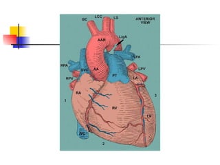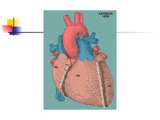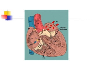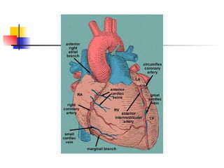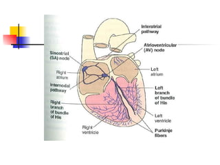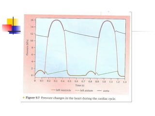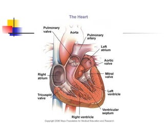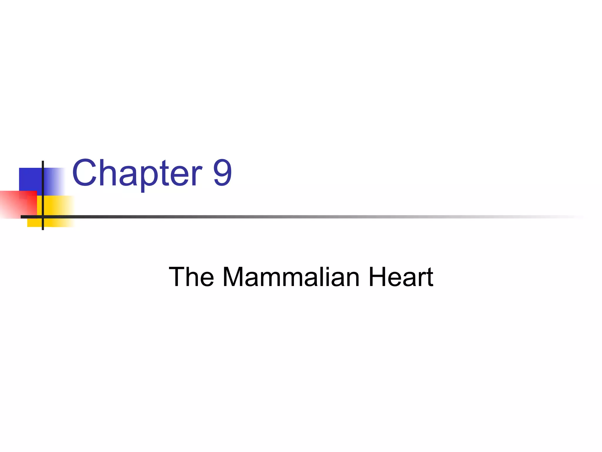 The mammalian heart is composed of cardiac muscle with interconnecting cells that facilitate the passing of electrical signals. It has four chambers - two atria that receive blood and two ventricles that pump blood out. The left ventricle wall is thicker than the right since it must pump blood around the body. The heart's natural pacemaker, the sinoatrial node, sets the rhythm for coordinated contraction and relaxation of the chambers. Electrocardiograms can be used to measure the heart's rhythm and rate.