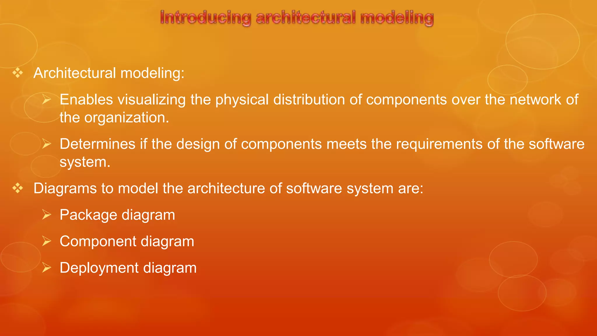This document discusses modeling software architecture using UML diagrams. It describes how to create package, component, and deployment diagrams to visualize the physical distribution of components. Package diagrams show functional groups and relationships, component diagrams model system execution units, and deployment diagrams depict hardware nodes and component deployment. The document provides details on modeling different viewtypes, relationships, and conventions for these diagram types.
