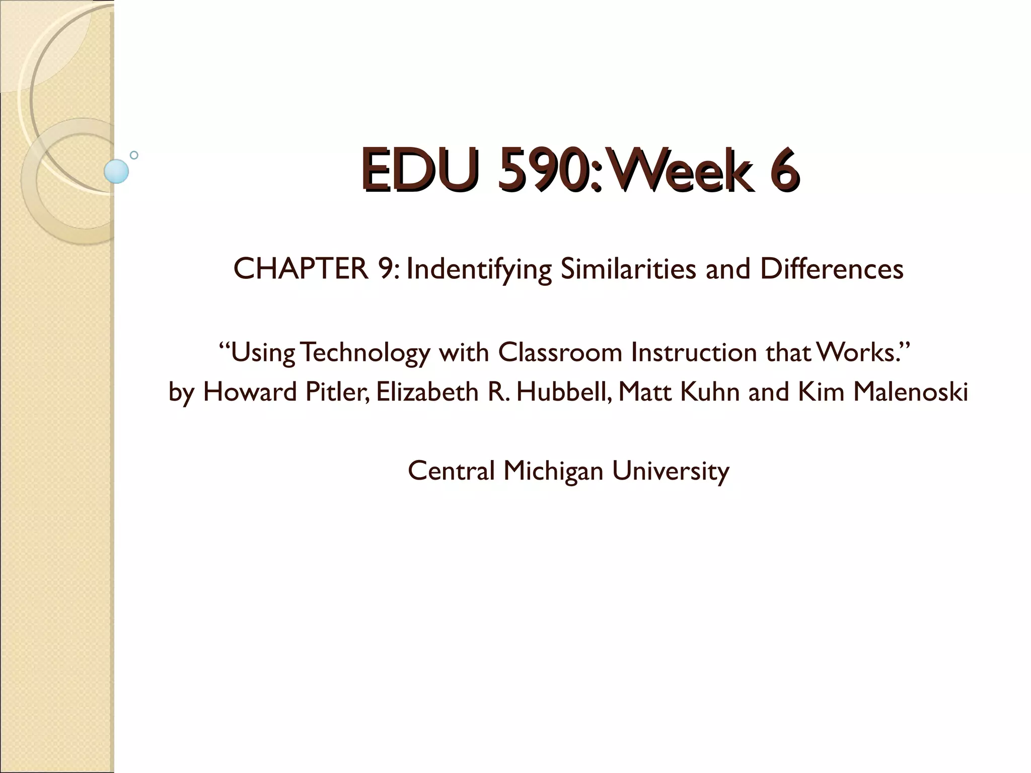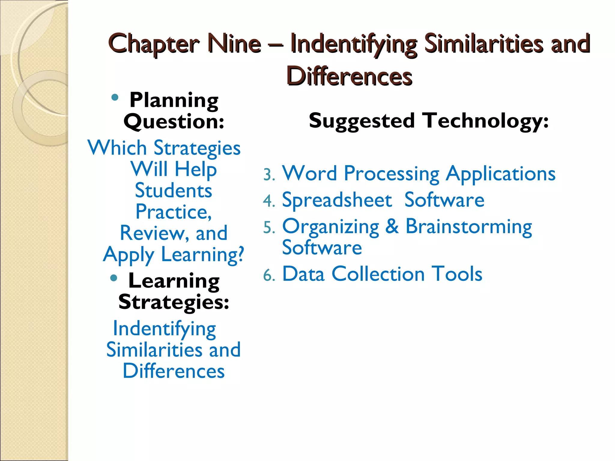 This document discusses identifying similarities and differences as a learning strategy. It recommends using word processing, spreadsheet, organizing/brainstorming software, and data collection tools to help students practice, review, and apply this strategy. Specific recommendations include using Microsoft Word and Excel to create diagrams, charts, and tables to illustrate similarities and differences. Organizing software like Kidspiration can help students visually portray connections and classifications. Data collection tools allow for accurate comparisons and graphical representation of data.