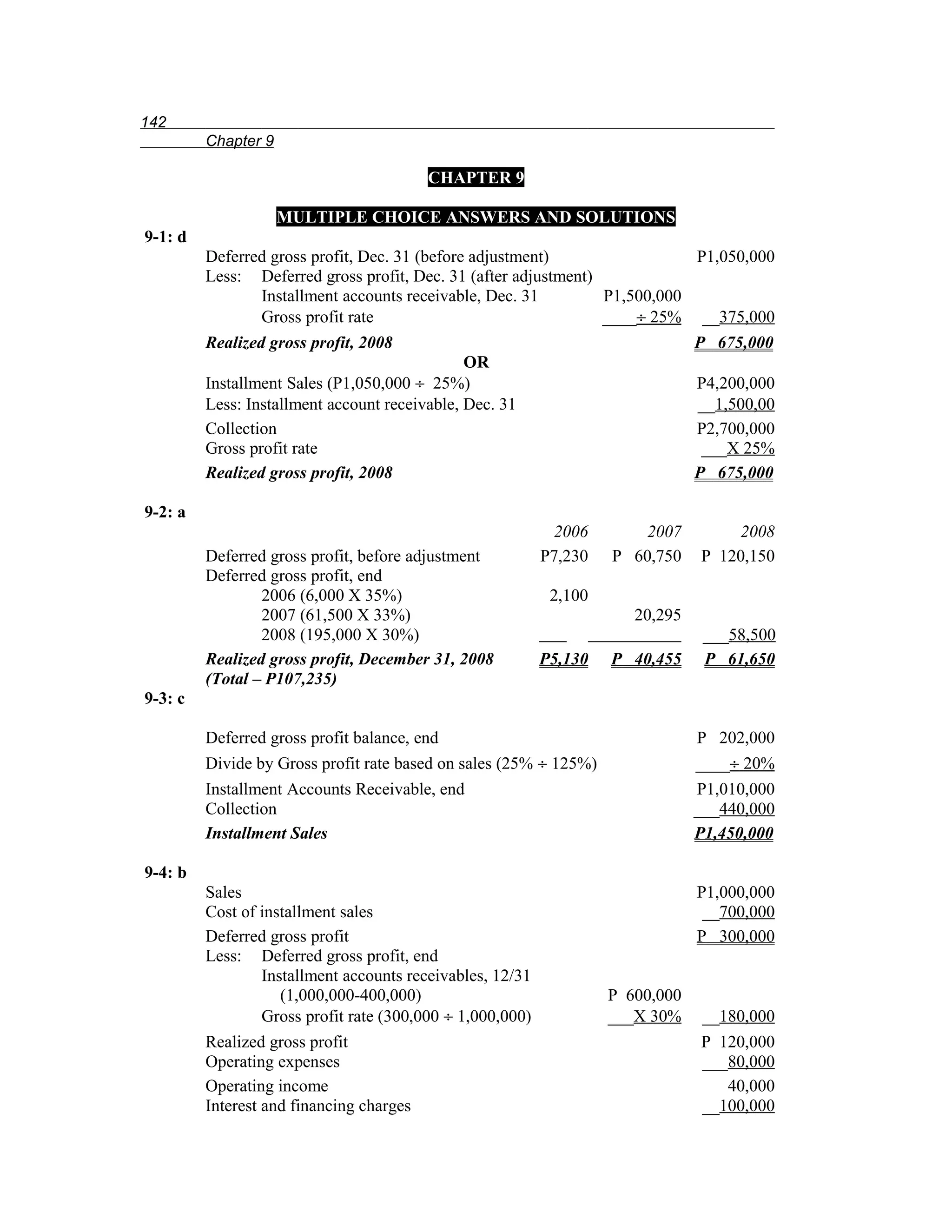 This chapter provides solutions to multiple choice questions about accounting for installment sales. It includes calculations of deferred gross profit, realized gross profit, losses on repossessions, and adjustments to accounts receivable. The solutions demonstrate how to apply gross profit rates and track installment balances over time to determine proper accounting for installment sale transactions.