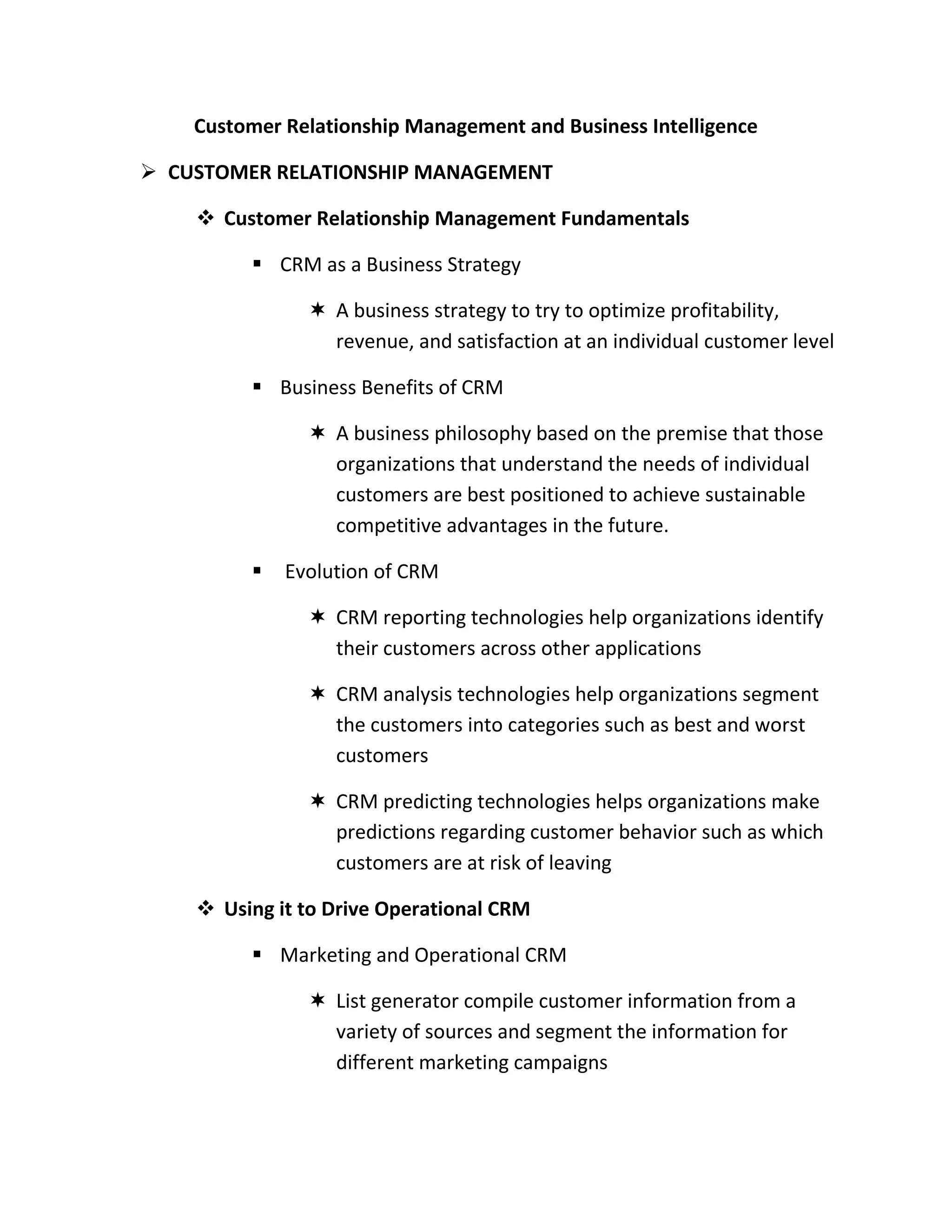 Customer Relationship Management (CRM) is a business strategy that uses technologies to understand individual customers in order to maximize profitability, revenue and satisfaction. CRM systems help organizations analyze customer data to segment customers, identify the best and worst, and predict customer behavior. Business Intelligence is the process of collecting data, analyzing patterns and trends to make informed business decisions. It provides value by reducing the time it takes to prepare data for analysis, complete the analysis, and determine appropriate actions based on analytic results.