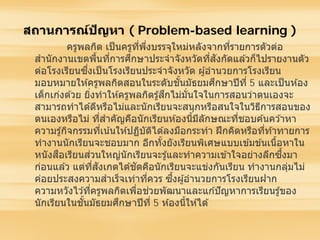learning ) ครูพลกิต เป็นครูที่พึ่งบรรจุใหม่หลังจากที่รายการตัวต่อ สํานักงานเขตพื้นที่การศึกษาประจําจังหวัดที่สังกัดแล ้วก็ไปรายงานตัว ต่อโรงเรียนซึ่งเป็นโรงเรียนประจําจังหวัด ผู้อํานวยการโรงเรียน มอบหมายให ้ครูพลกิตสอนในระดับชั้นมัธยมศึกษาปีที่ 5 และเป็นห ้อง เด็กเก่งด ้วย ยิ่งทําให ้ครูพลกิตรู้สึกไม่มั่นใจในการสอนว่าตนเองจะ สามารถทําได ้ดีหรือไม่และนักเรียนจะสนุกหรือสนใจในวิธีการสอนของ ตนเองหรือไม่ ที่สําคัญคือนักเรียนห ้องนี้มีลักษณะที่ชอบค ้นคว ้าหา ความรู้กิจกรรมที่เน้นให ้ปฏิบัติได ้ลงมือกระทํา ฝึกคิดหรือที่ท ้าทายการ ทํางานนักเรียนจะชอบมาก อีกทั้งยังเรียนพิเศษแบบเข ้มข ้นเนื้อหาใน หนังสือเรียนส่วนใหญ่นักเรียนจะรู้และทําความเข ้าใจอย่างลึกซึ้งมา ก่อนแล ้ว แต่ที่สังเกตได ้ชัดคือนักเรียนจะแข่งกันเรียน ทํางานกลุ่มไม่ ค่อยประสงความสําเร็จเท่าที่ควร ซึ้งผู้อํานวยการโรงเรียนฝาก ความหวังไว ้ที่ครูพลกิตเพื่อช่วยพัฒนาและแก ้ปัญหาการเรียนรู้ของ นักเรียนในชั้นมัธยมศึกษาปีที่ 5 ห ้องนี้ให ้ได ้