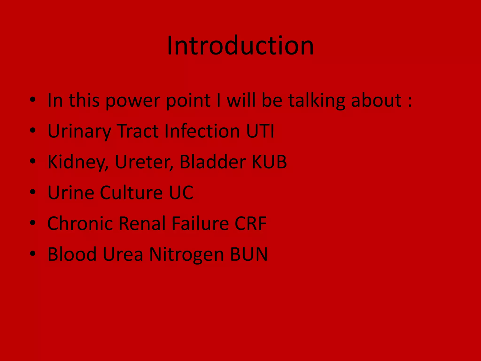 This document discusses various topics related to urinary tract health: urinary tract infections (UTIs), kidney-ureter-bladder imaging (KUB), urine cultures, chronic renal failure (CRF), and blood urea nitrogen (BUN) testing. It provides details on the anatomy of the urinary system, symptoms and treatments for UTIs, how KUB, urine cultures and BUN tests are used to diagnose issues, and causes and management of CRF.