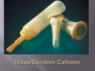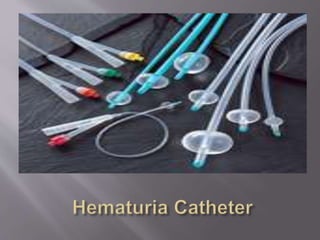 This document discusses urinary catheterization. It describes catheters as plastic tubes inserted into the bladder via the urethra to drain urine or inject liquids for treatment or diagnosis. Critically ill patients requiring strict urine output monitoring are often catheterized. The document describes different catheter types including Foley, Robinson, Coude, and hematuria catheters.