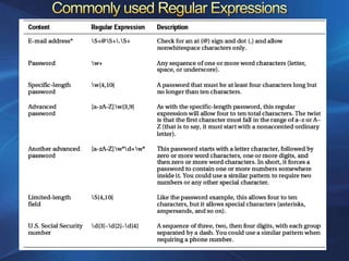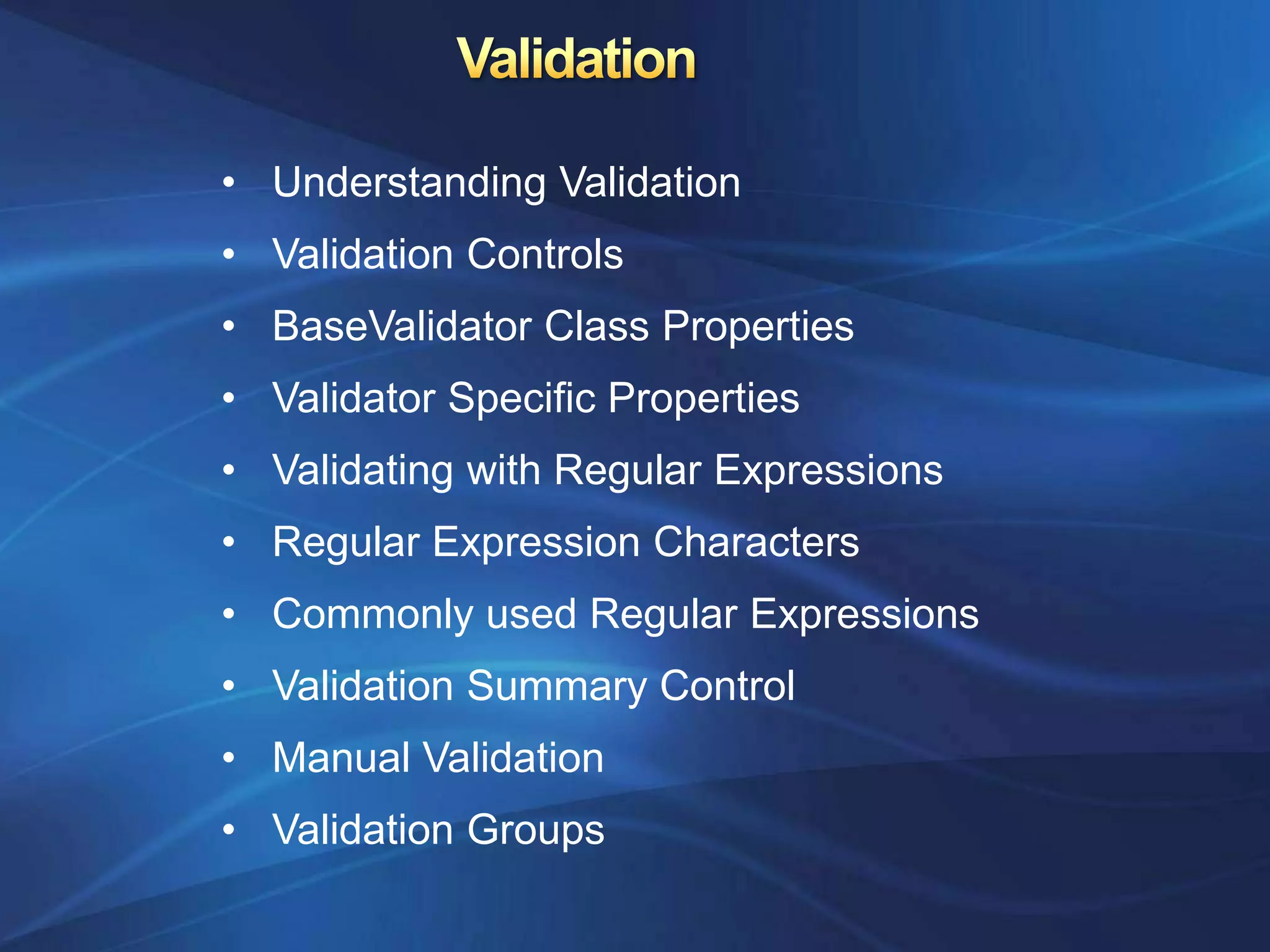 Validation in ASP.NET ensures that user-entered data meets defined formats and criteria. There are five validator controls that check for specific errors, like missing required fields or invalid data types. All validators inherit properties from the BaseValidator class and can be configured to display error messages and enable client-side validation. Regular expression validators check input against patterns. Validation controls can be grouped and their errors displayed in a summary for the user to easily see and correct mistakes. Manual validation is also possible by disabling the controls and writing custom validation logic.