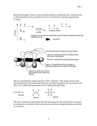 Alkynes are hydrocarbons containing a carbon-carbon triple bond. This chapter discusses the structure, bonding, nomenclature, and reactions of alkynes. Alkynes can undergo hydrogenation to form alkanes, addition of hydrogen halides, and elimination reactions to form alkynes. Their reactivity is influenced by the hybridization of the carbons in the triple bond and the acidity of sp-hybridized carbon-hydrogen bonds.