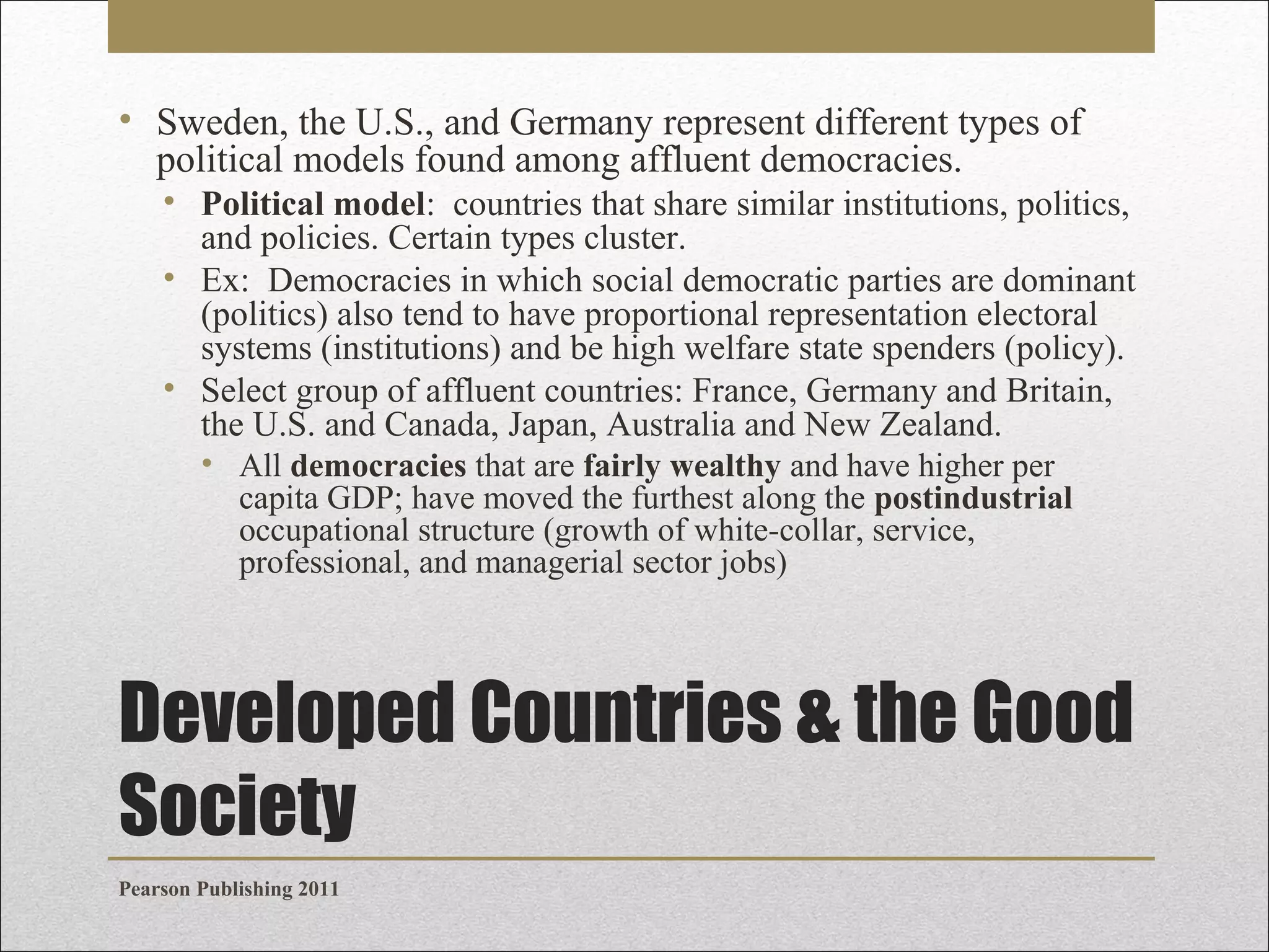 The document summarizes different political models found among affluent democracies: the social democratic model exemplified by Scandinavian countries like Sweden; the extreme market model of the United States; and the Christian democratic model found in countries like Germany. It discusses the historical development, political institutions, and welfare policies of these different models.
