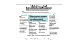 The document discusses concepts related to data warehousing and business intelligence management. It provides an overview of key terms and components, including Inmon and Kimball's approaches to data warehouse architecture. Inmon defined the classic characteristics of a data warehouse and his "Corporate Information Factory" model, which includes raw operational data, an operational data store, data warehouse, and data marts. Kimball emphasized dimensional modeling and his "DW chess pieces" components to structure data for analysis. The document then covers typical activities involved in data warehousing and business intelligence management.