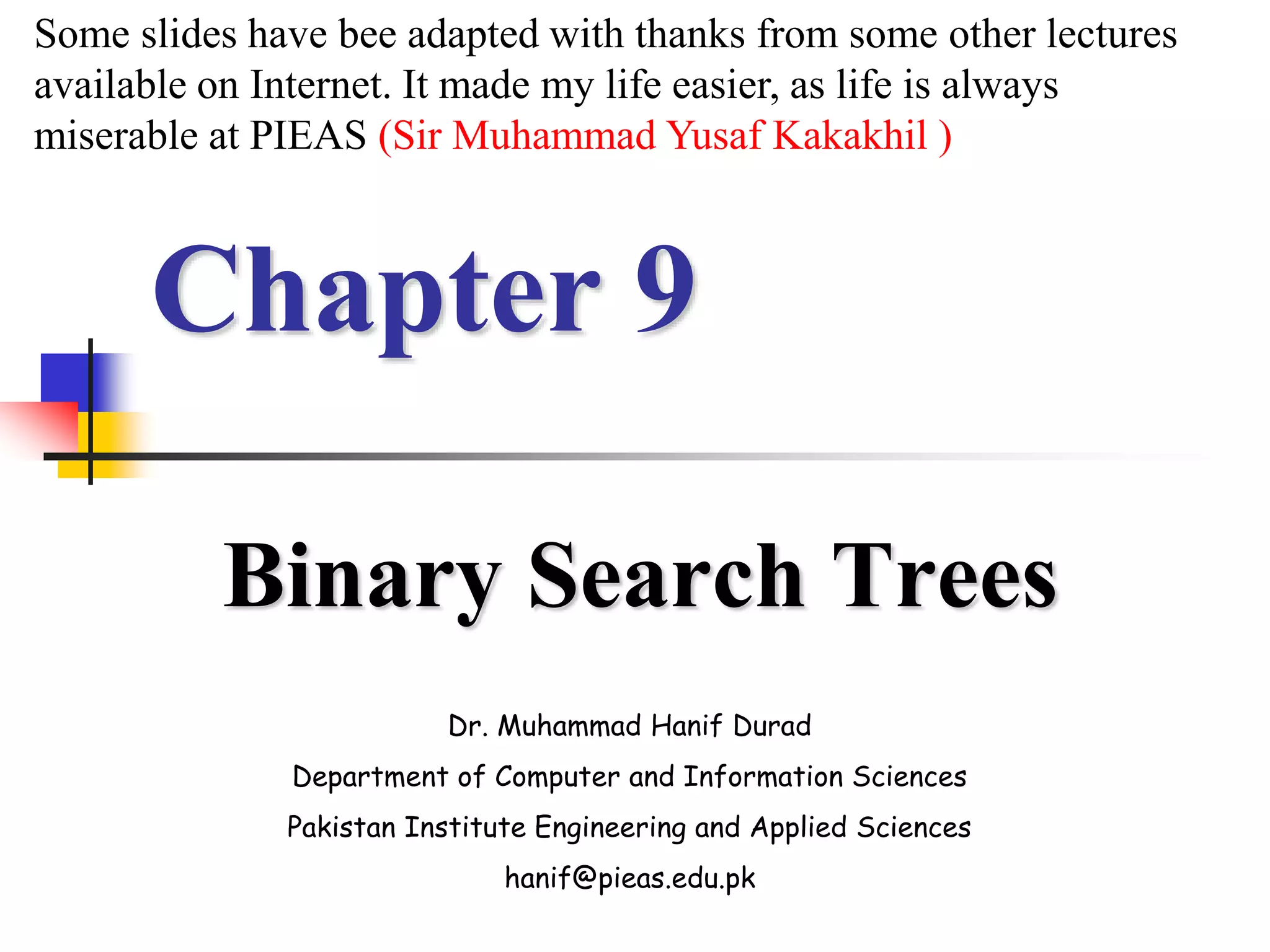 The document discusses binary search trees (BSTs), including their representation as linked data structures, common operations like search, insertion, deletion, finding minimum/maximum elements, and predecessors/successors. While BST operations take O(h) time where h is the tree height, h can be as large as n for an unbalanced tree. The document thus notes that better balanced search trees like AVL trees and red-black trees are preferable to ensure O(log n) performance of operations.