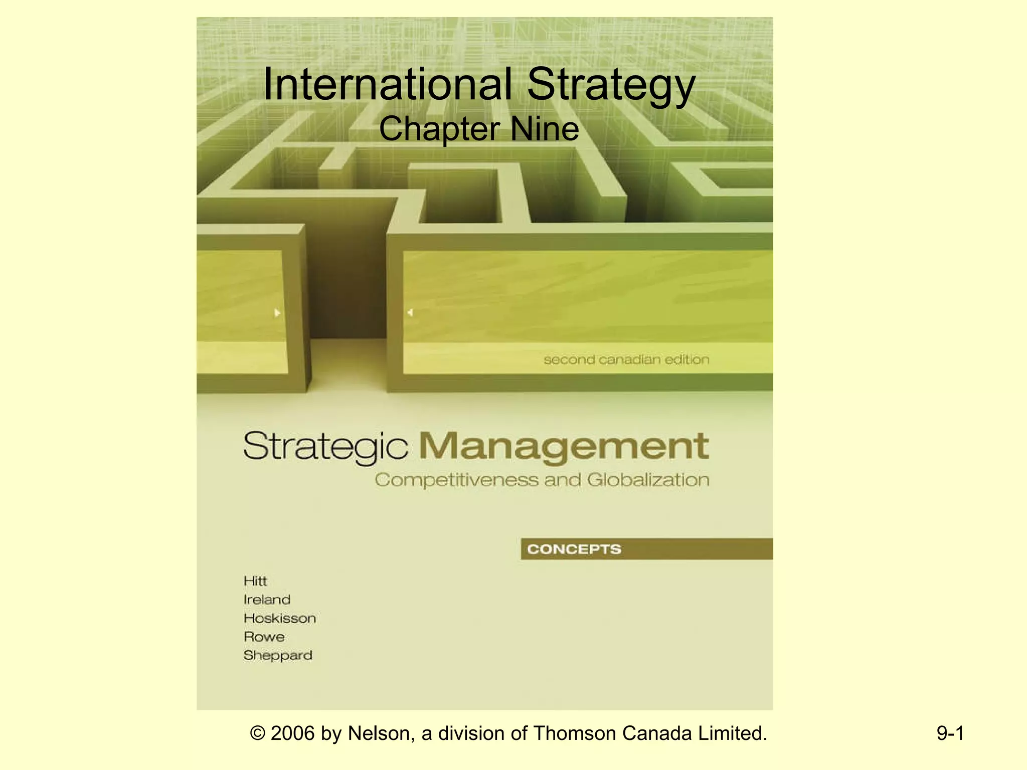 This document discusses international strategy and opportunities for firms. It covers traditional motives for international diversification like accessing larger markets and resources. It also discusses three levels of international strategy - multinational, global, and transnational. Key risks of internationalization include political risks from government instability and economic risks from currency and inflation rate fluctuations. Modes of entering foreign markets addressed include exporting, licensing, strategic alliances, acquisitions, and new wholly-owned subsidiaries.