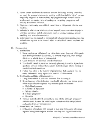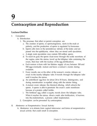 Contraception and Reproduction discusses various methods of contraception including barrier methods like condoms and diaphragms, hormonal methods like oral contraceptives, and extended cycle pills. Barrier methods work by blocking sperm from reaching an egg while hormonal methods prevent ovulation. Oral contraceptives contain synthetic hormones that thicken cervical mucus, thin the uterine lining, and prevent ovulation. Extended cycle pills reduce the number of periods a woman has per year from monthly to every three months. Both methods are highly effective at preventing pregnancy when taken correctly but do not protect against sexually transmitted infections.