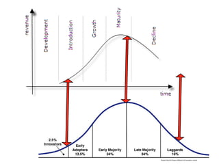 This document discusses product and branding strategies. It covers the product life cycle (PLC) model which explains how market response and marketing activities change over a product's lifetime. The PLC includes introduction, growth, maturity, and decline stages. Branding is also discussed as creating relationships with customers through symbols, names, and unique identifiers for products. Strong brands have high brand equity which provides a pricing premium over generic competitors. Packaging is also mentioned as an important part of branding that protects products and communicates with customers.
